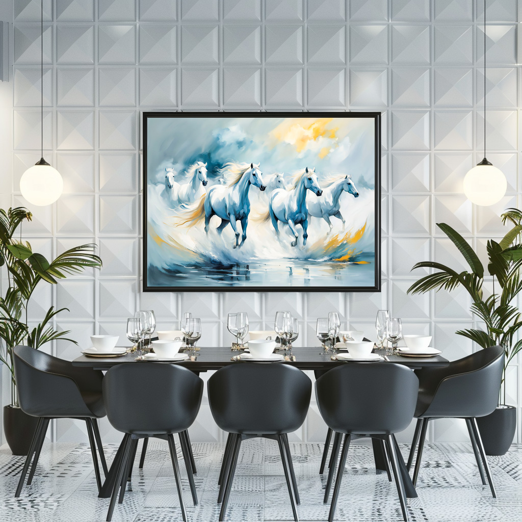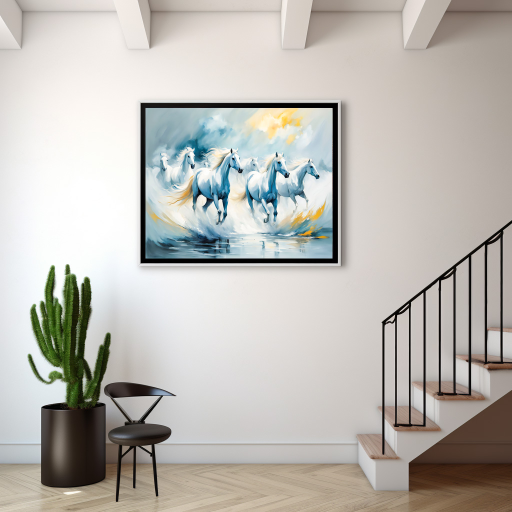 impressive oil-style painting of a herd of white horses galloping through the ocean waves. A breathtaking depiction of power and unity.