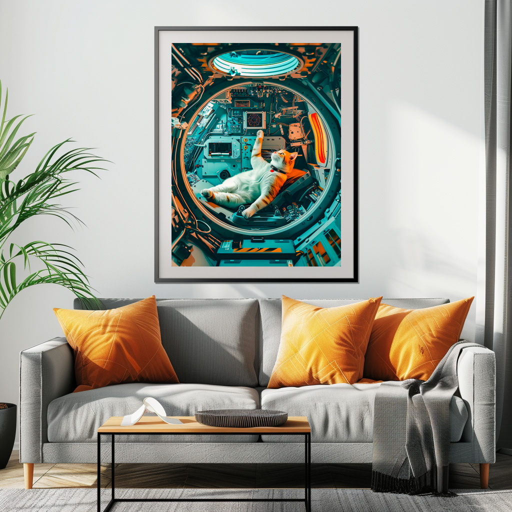 "Orange and white cat in spacecraft cockpit" by Anja Frost