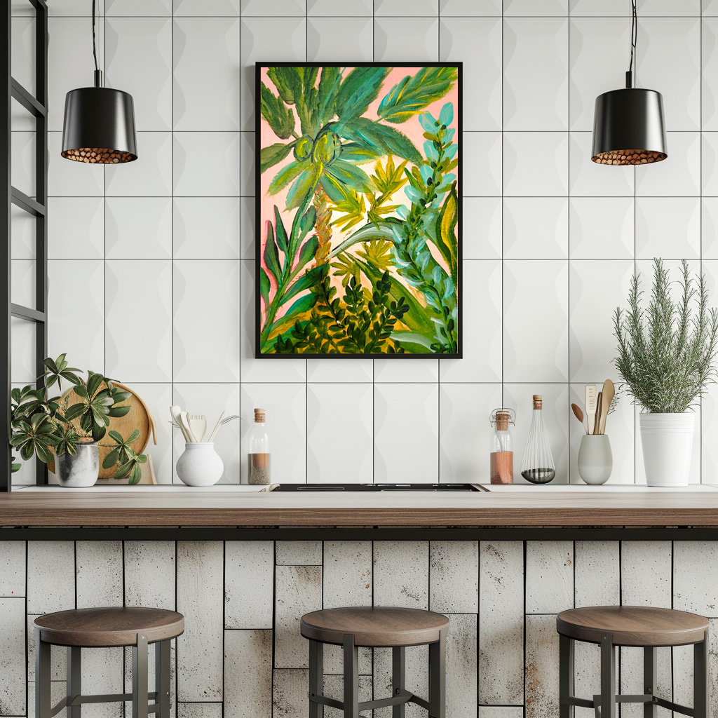 Un paradiso tropicale vi aspetta! Perdetevi nei toni verdi e nelle sfumature dorate di questo quadro.