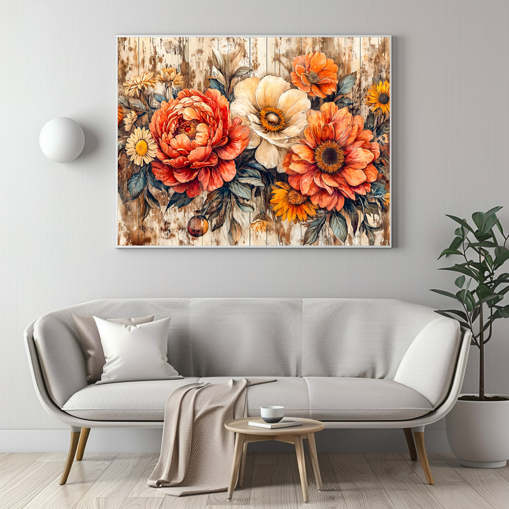 Rich orange marigolds and creamy peonies create a striking floral contrast on aged, dark wood. A vintage-inspired still life bursting with warmth and shabby chic beauty.