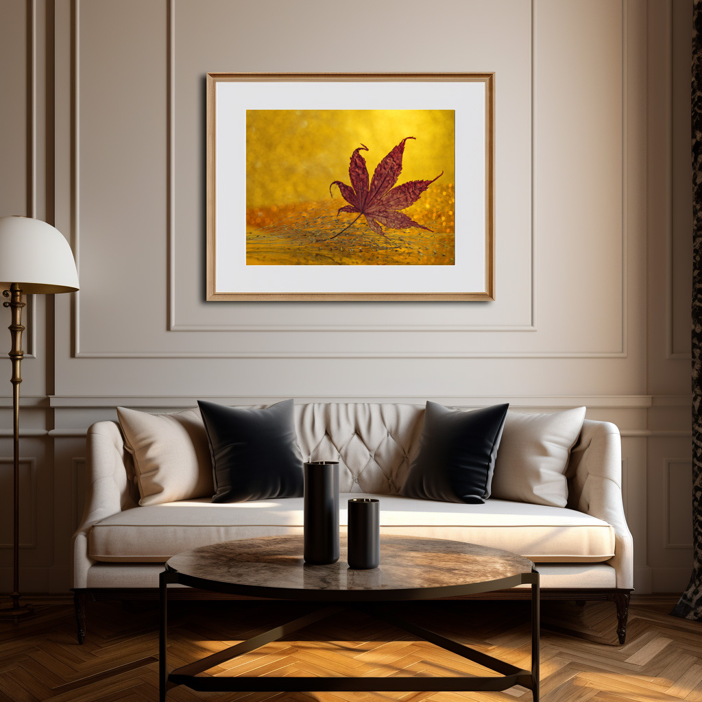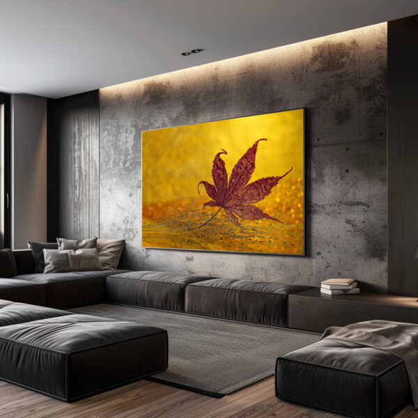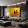 Composizione di una foglia secca su avena su uno sfondo giallo luminoso.