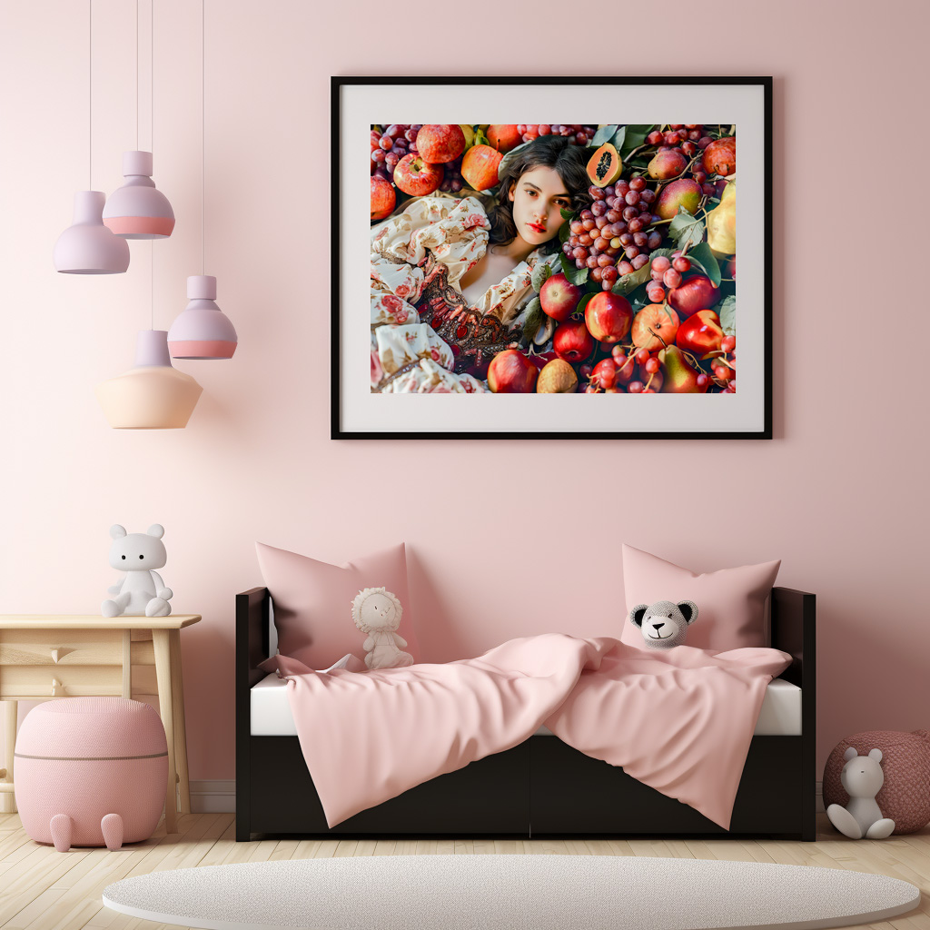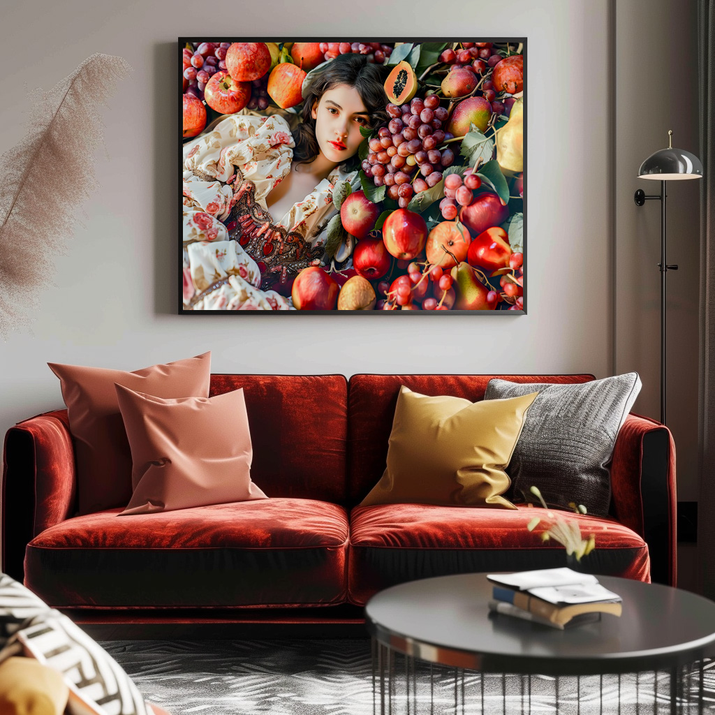 A woman poses with apples and grapes in a lush, nature-inspired portrait. The scene evokes freshness, elegance, and artistic harmony.