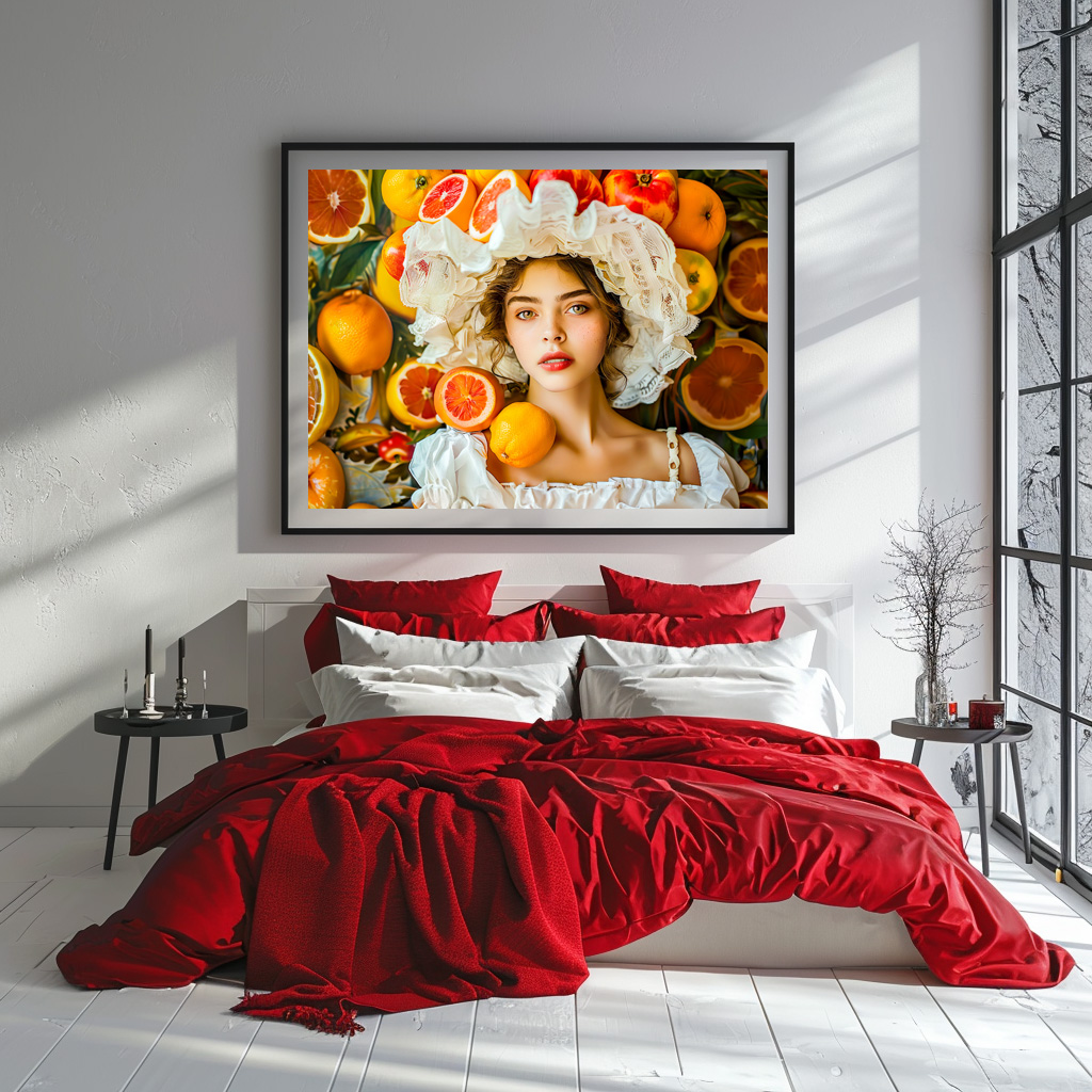 A woman poses with grape fruits and white summer hat. The portrait combines freshness, color, and artistic styling in a lush natural setting.