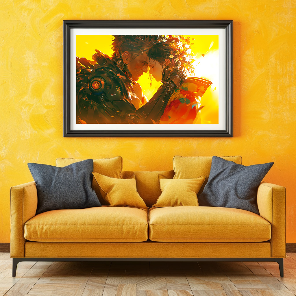 Ein berührender Moment zwischen einem kybernetisch verbesserten Mann und einer jungen Frau mit Blumen im Haar. Inmitten einer futuristischen Welt voller Technik treffen Menschlichkeit und Mechanik aufeinander. Die Szene ist von Wärme, Liebe und Melancholie durchzogen – ein stilles Versprechen in einer Welt der Maschinen.
