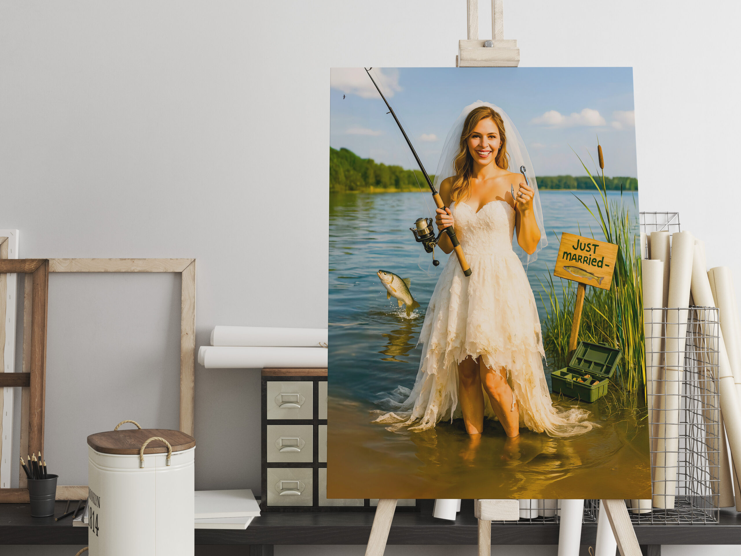 raxxa Canva: Bride with Fishing Rod and Hook at Lakeside