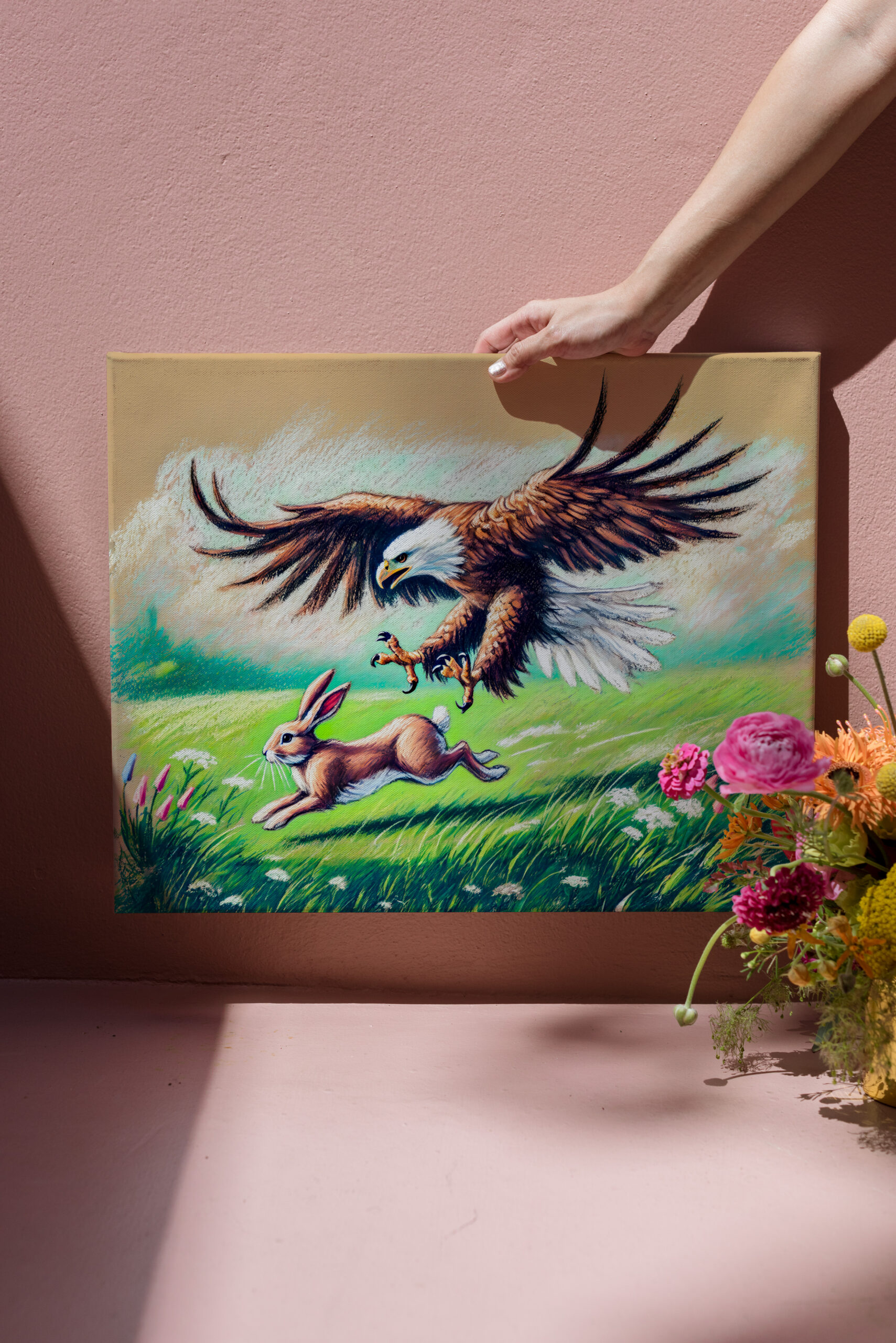 eagle swoops down with precision to catch a rabbit in a grassy field. This pastel chalk drawing portrays the swift instincts and dynamic movements of the wild in a captivating scene