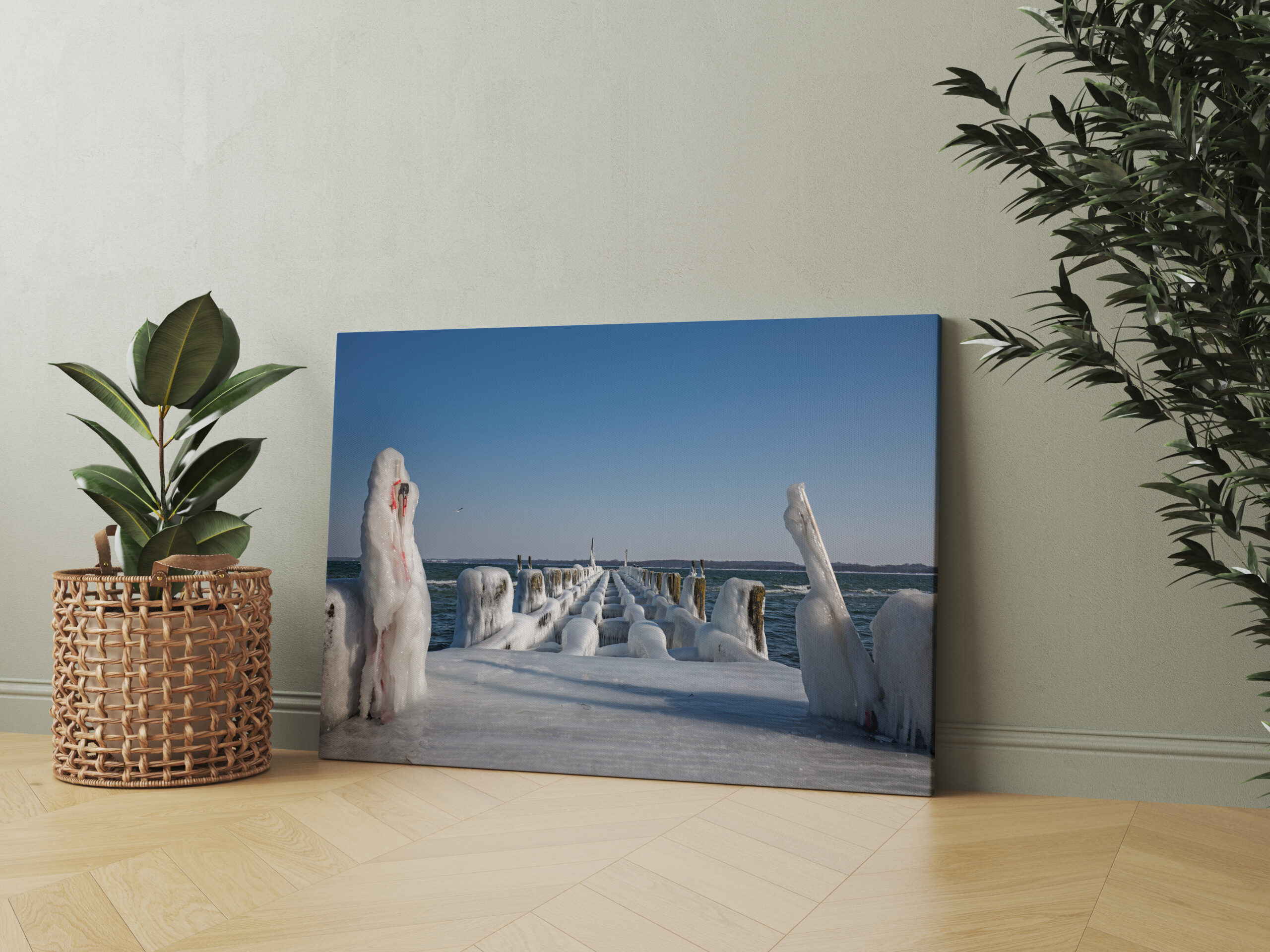 Una gelida giornata invernale a Travemünde. Le temperature gelide e il forte vento hanno ricoperto tutto con uno spesso strato di ghiaccio.