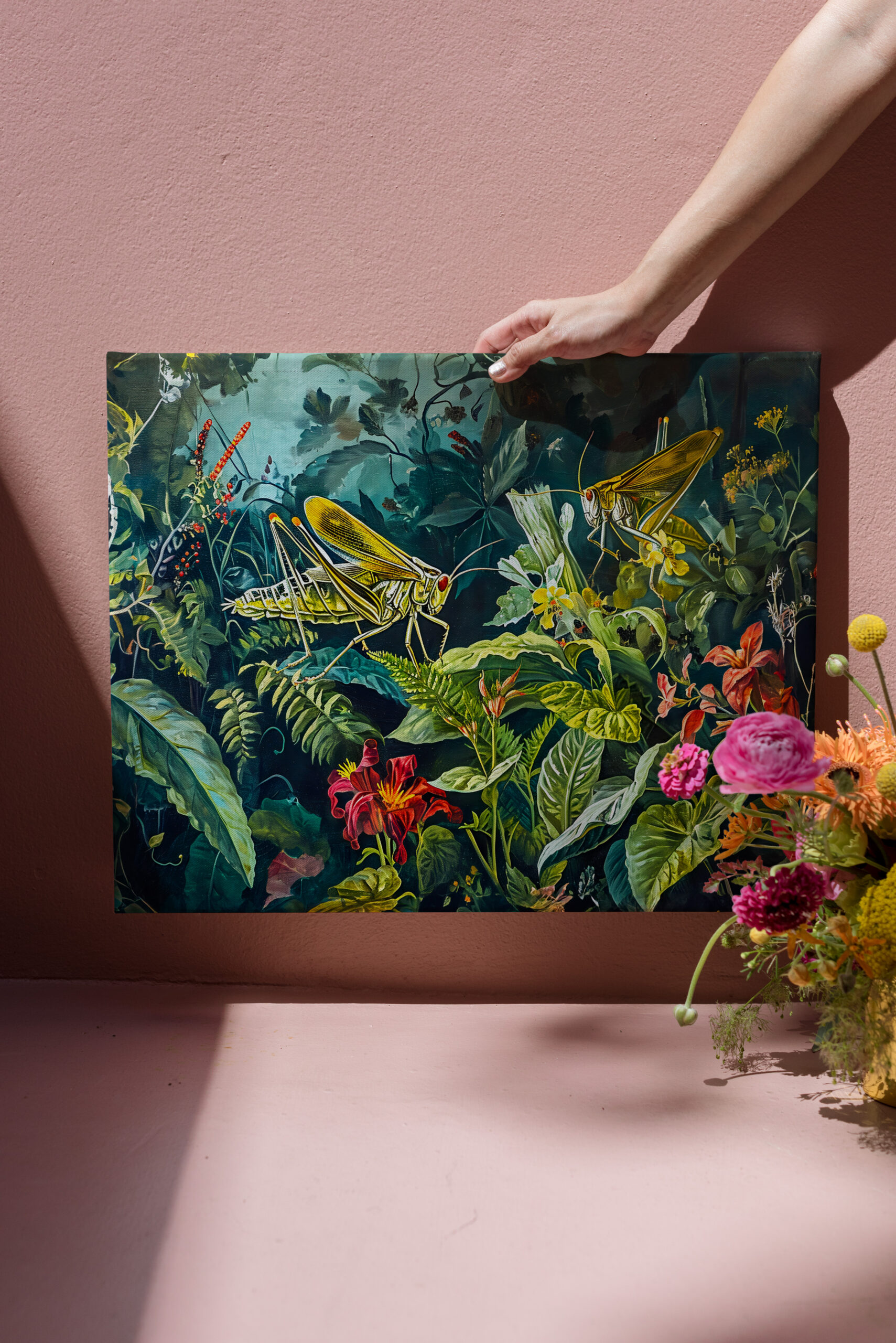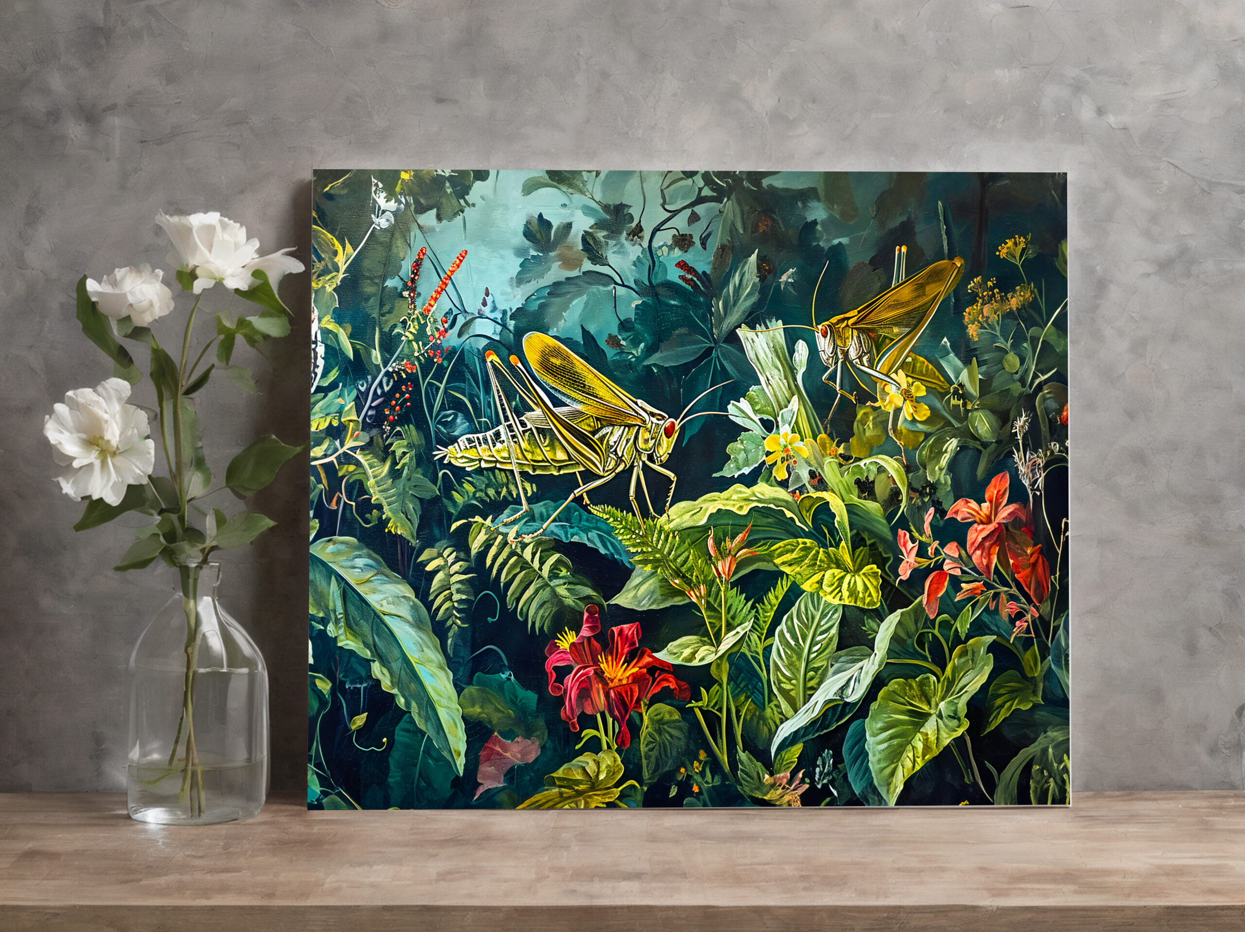"Green Grasshoppers in an Herb Garden Illustration" by Anja Frost