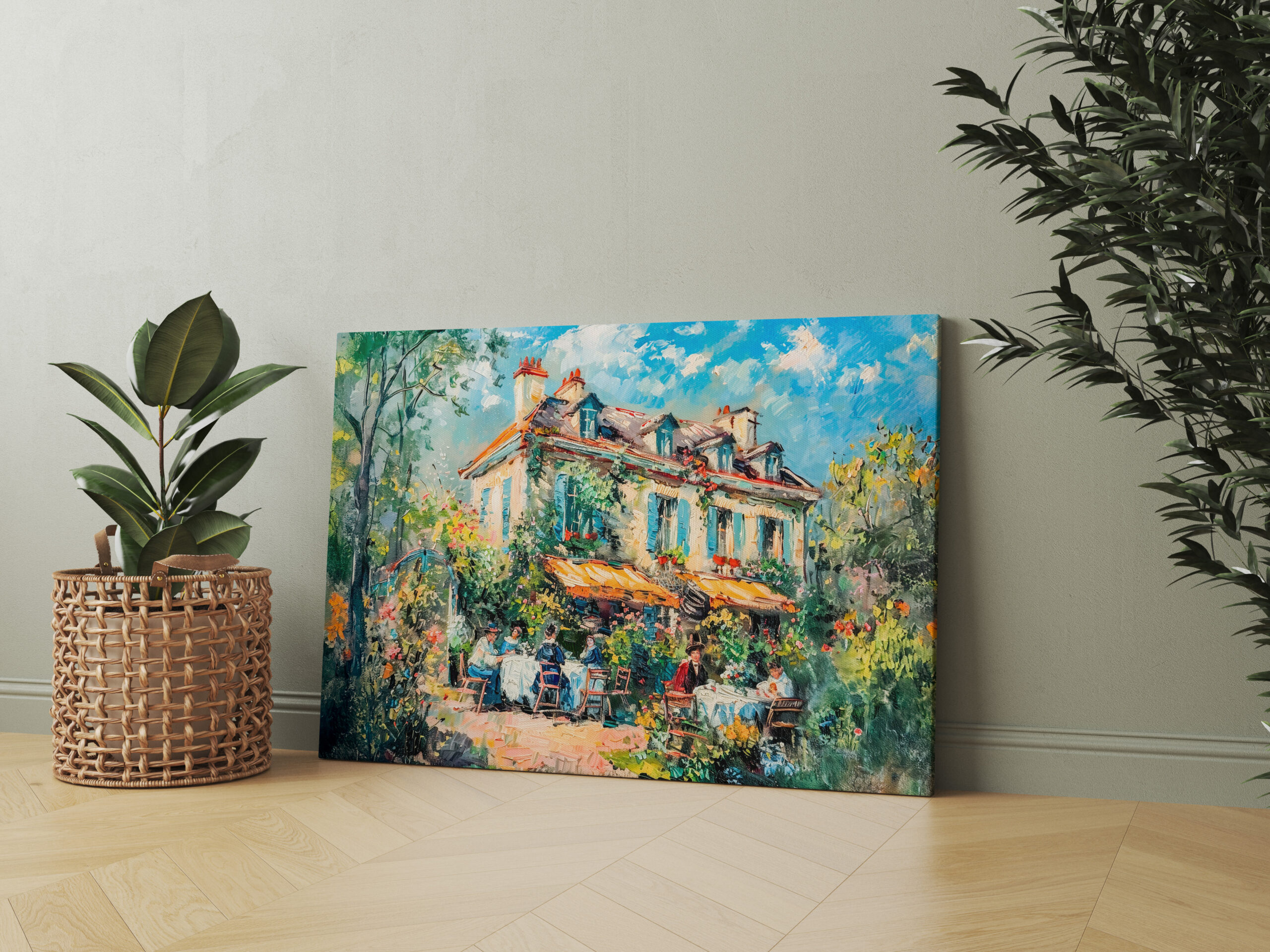 Impressionist painting of a house with people gathered at garden tables, enjoying leisure time in a lush blooming setting