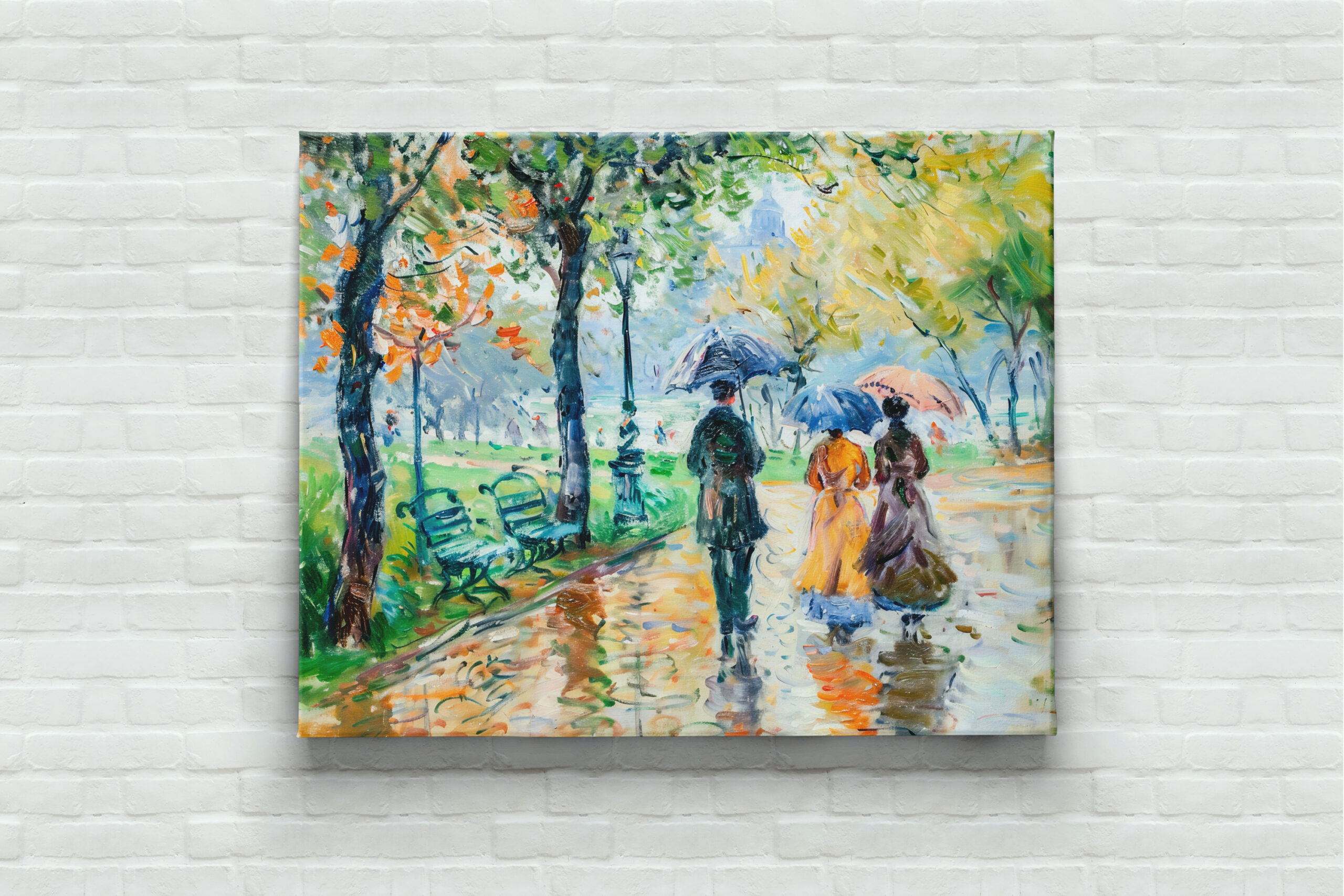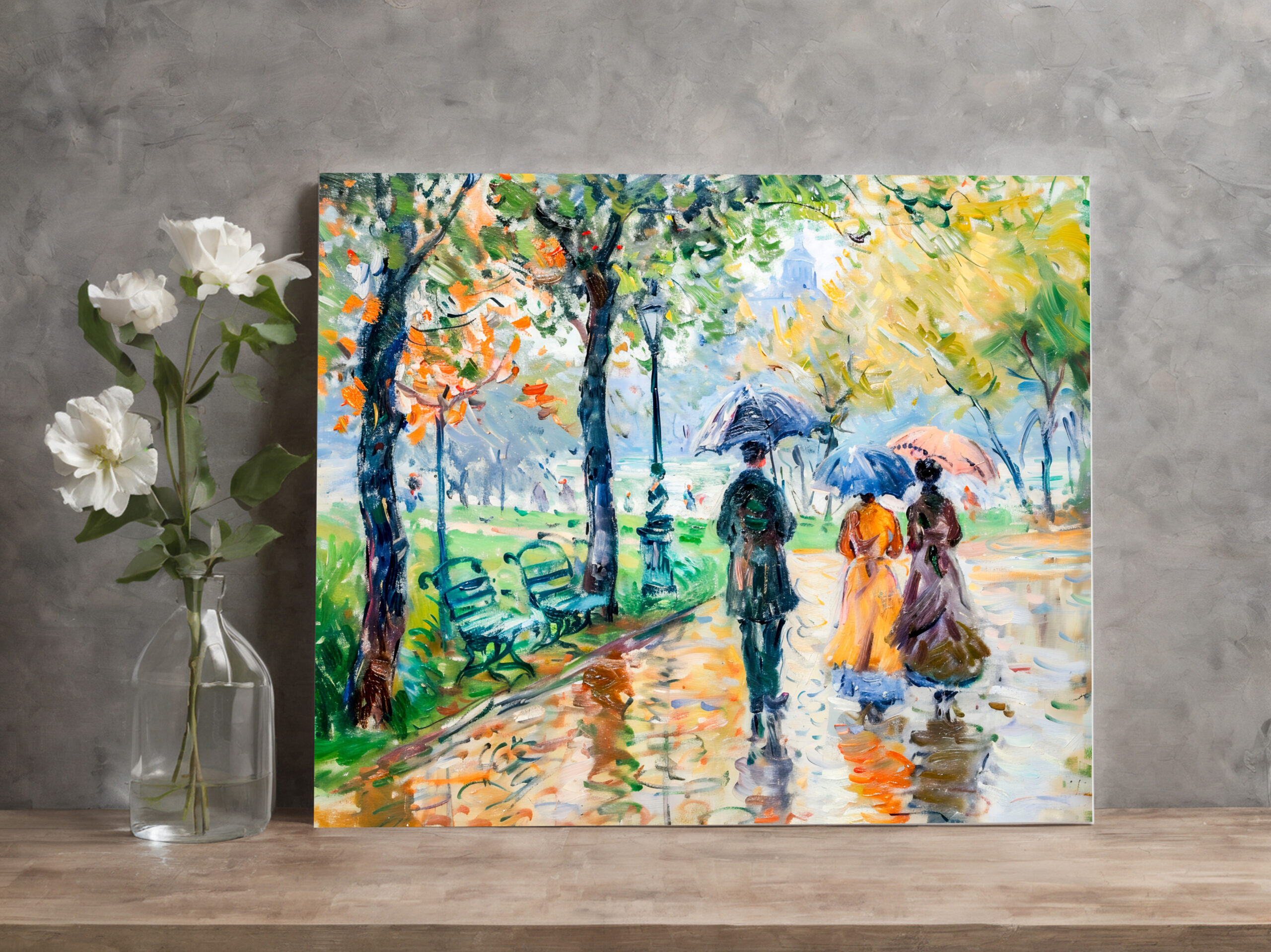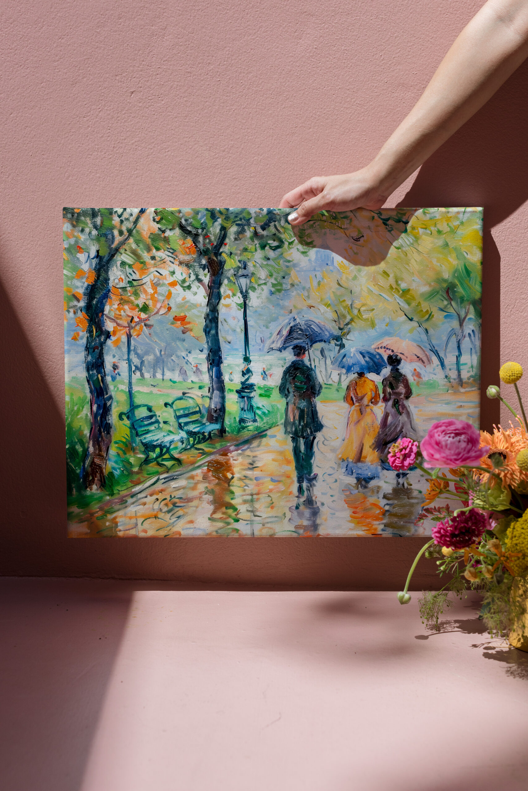 Impressionist painting of people walking with umbrellas in a park, soft colors and gentle rainy mood.