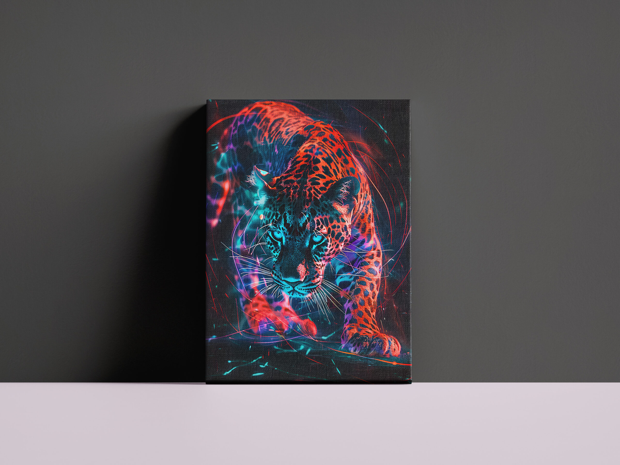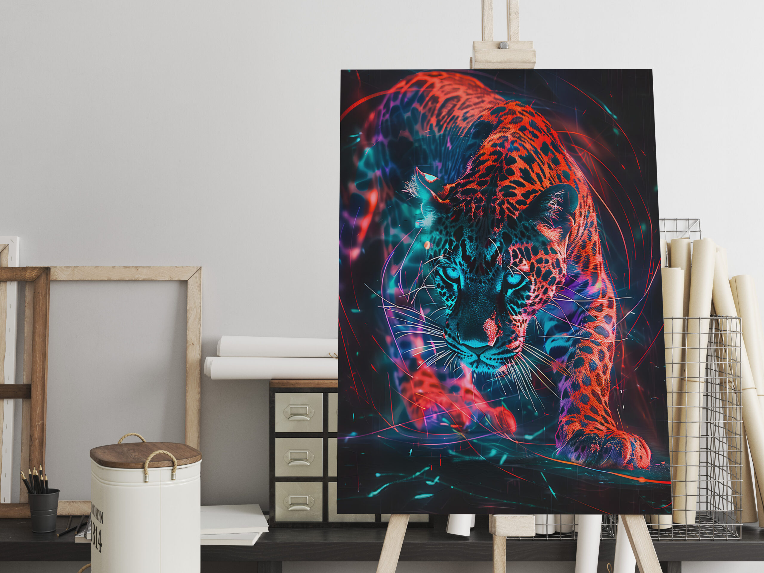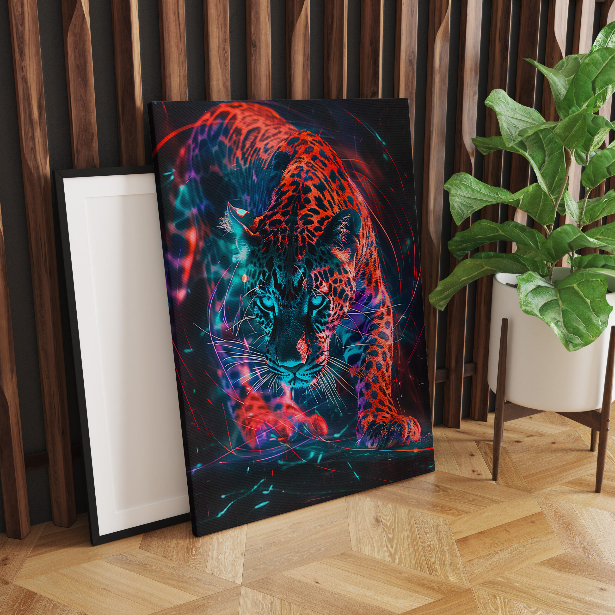 leopard bathed in reddish neon light trails, evoking a cosmic and enchanting atmosphere.