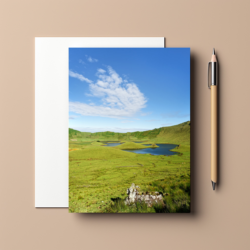 Der Krater des Vulkans der Azoreninsel Corvo hat gewaltige Ausmaße, Seen in der Kratermitte, markante Wolkenformation, Felsen im Vordergrund – Location- Portugal, Azoren, Insel Corvo
