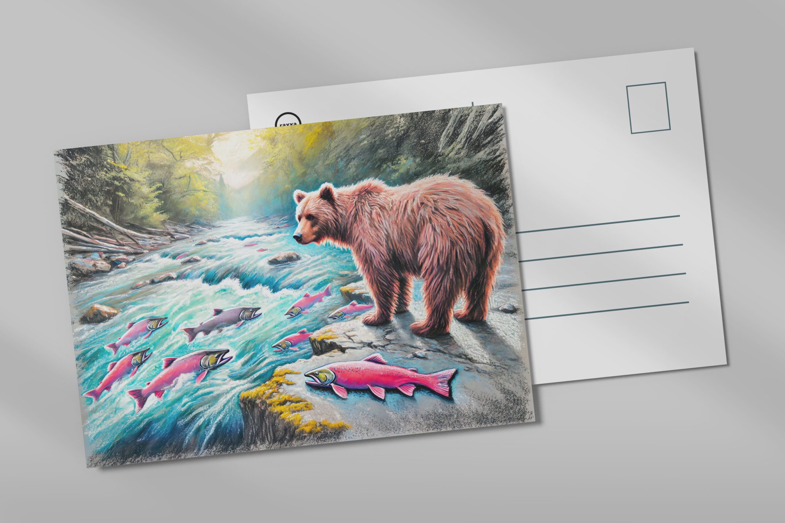 brown bear observes salmon swimming upstream in a lush forest river, depicted in vivid pastel chalk colors, capturing the essence of wildlife and nature.