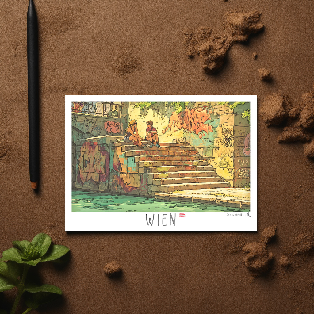 Due amici siedono sulla riva dipinta, l'acqua scintilla di verde turchese. Il sole cade dorato sui graffiti, come se l'estate fosse in ascolto.