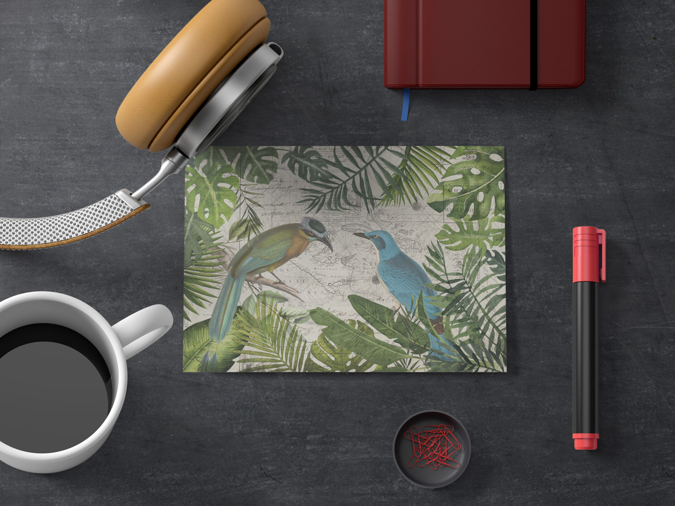 Giungla tropicale con uccelli, piante e fiori esotici su una mappa d'epoca