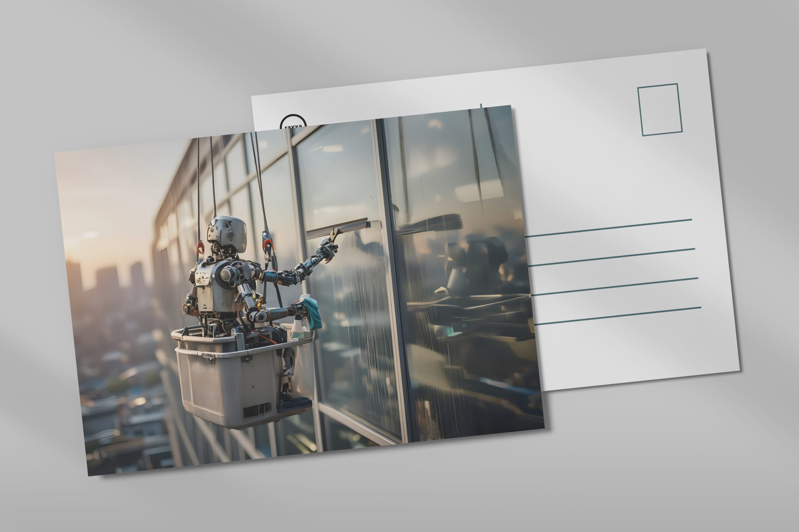 Ein humanoider KI-Roboter reinigt Glasfassaden in luftiger Höhe und steht für Sicherheit, Präzision und moderne Automatisierung. Die urbane Skyline, klare Technik und der reale Arbeitseinsatz machen dieses Motiv zu einem starken Symbol für die Zukunft gefährlicher Jobs.