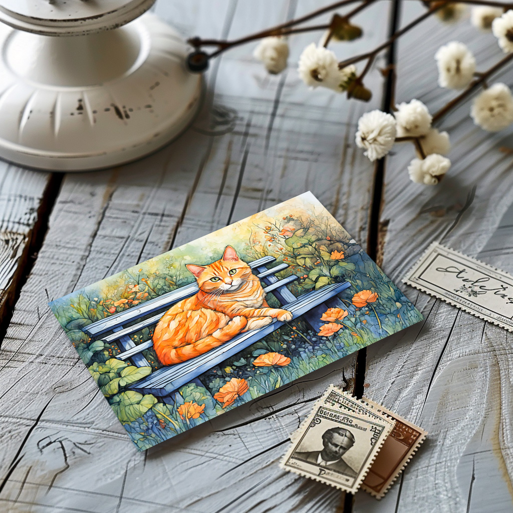 "Watercolor of Cat on Bench in Flower Garden" by Anja Frost