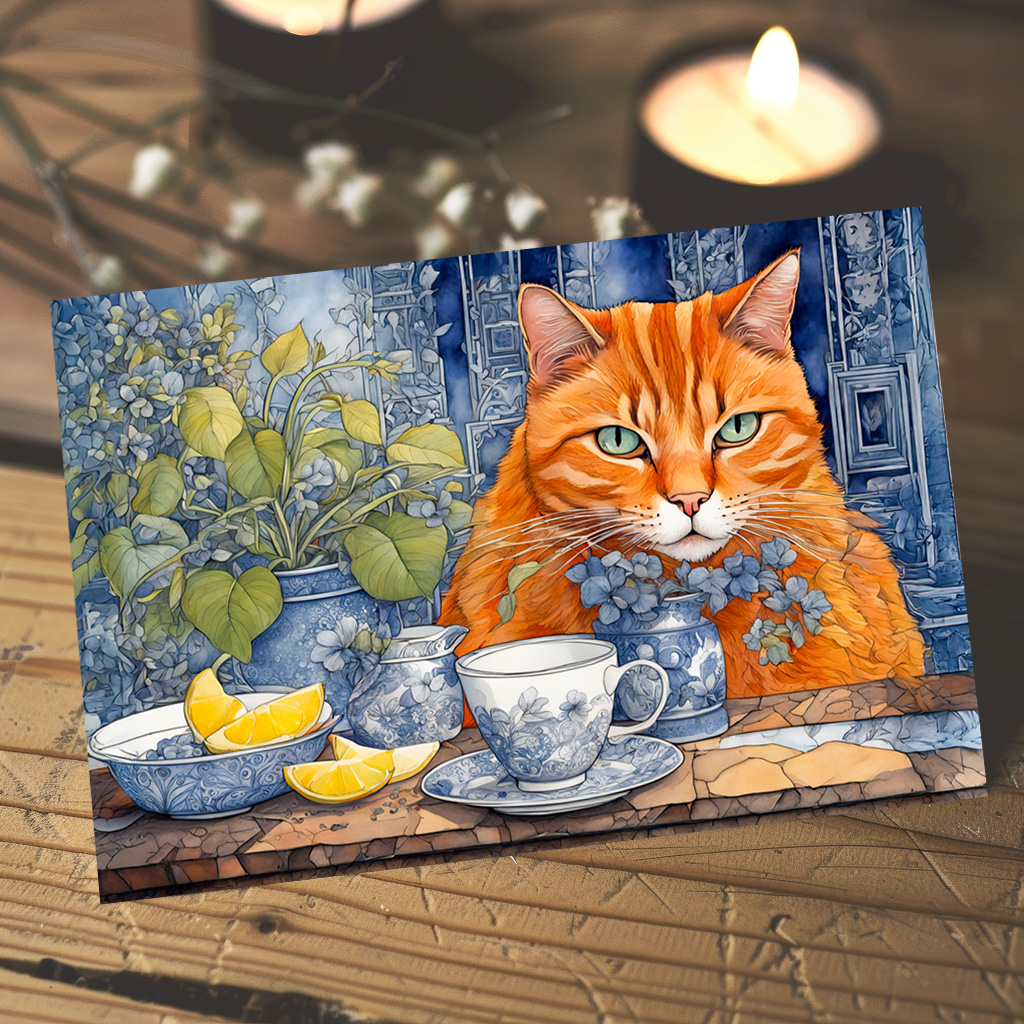 beautiful watercolor artwork featuring an orange tabby cat sitting near a lemon tea set on a rustic blue table. A charming and vibrant scene.