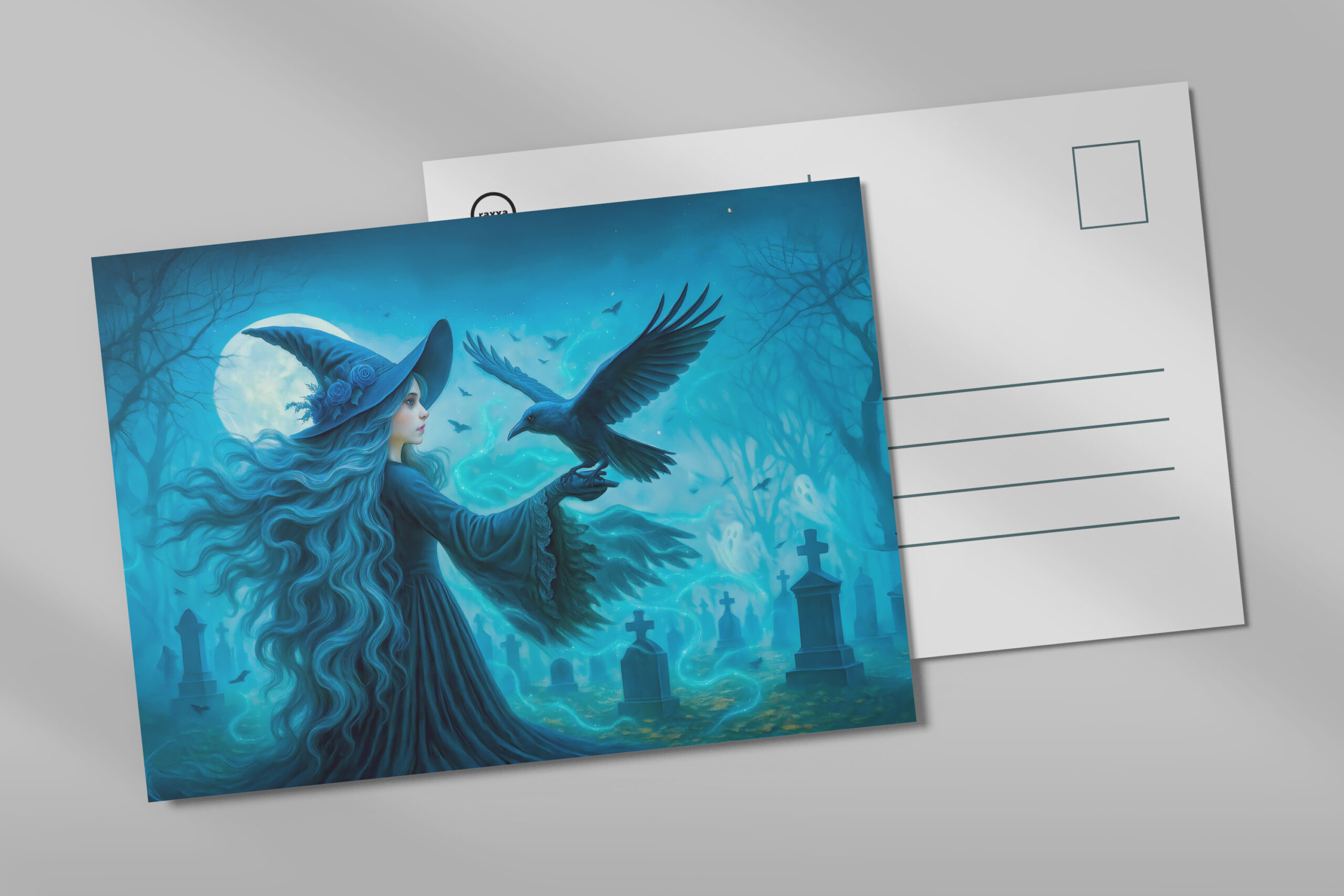 "Witch with raven in moonlit graveyard" by Anja Frost