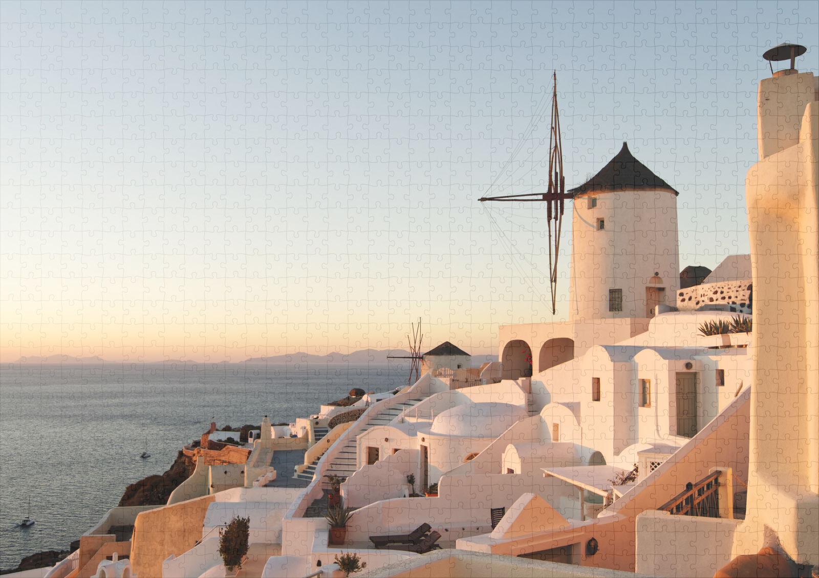 Pittoresca atmosfera serale a Santorini nel villaggio di Oia, vista sulle case con i mulini a vento noti come punti di riferimento - Località: Grecia, Cicladi, Santorini (Santorini, Thira), Oia