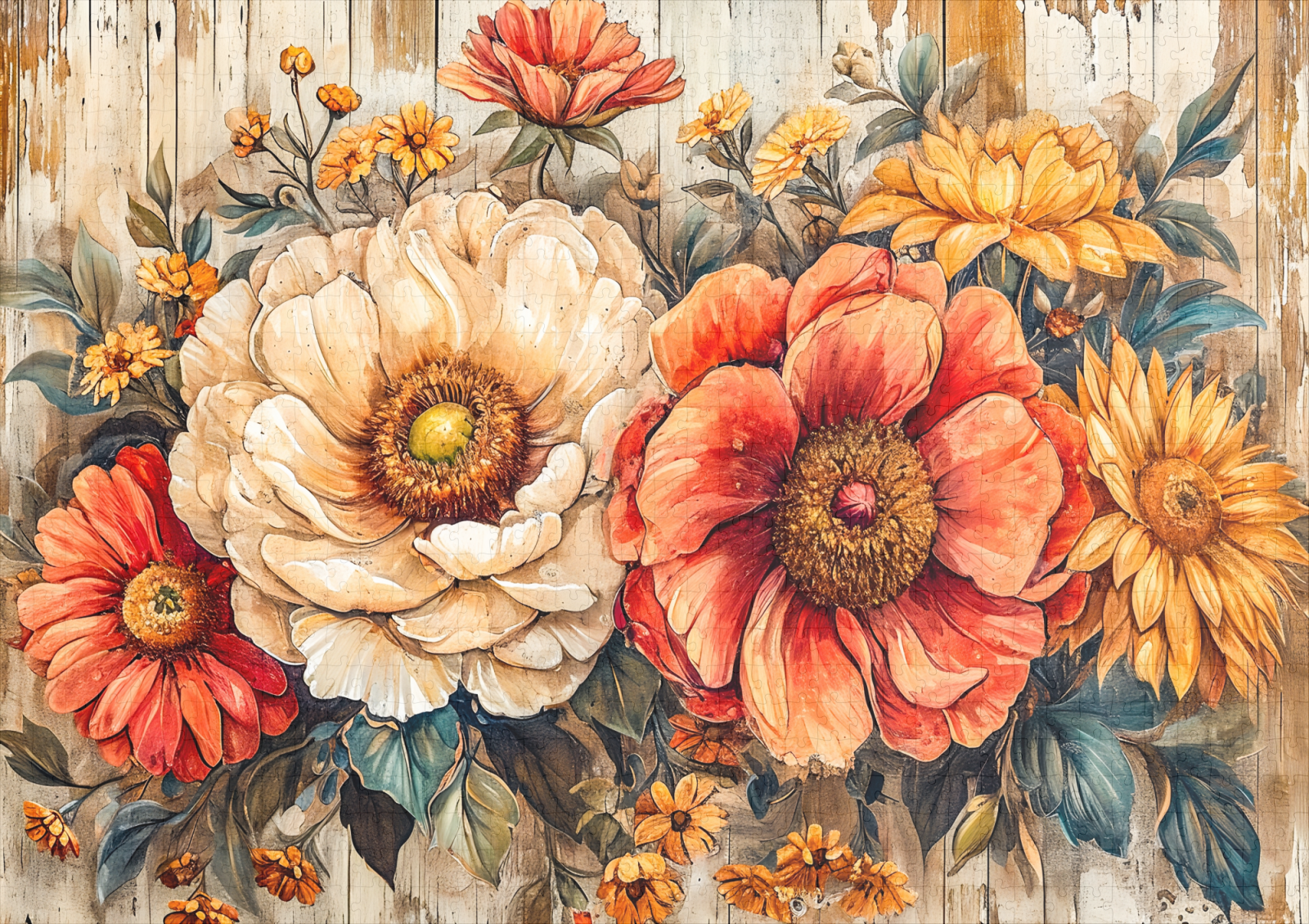 A lush floral arrangement featuring a cream peony, orange zinnias, and blue wildflowers set against aged rustic wood. A bold yet soft composition with vintage and country appeal.