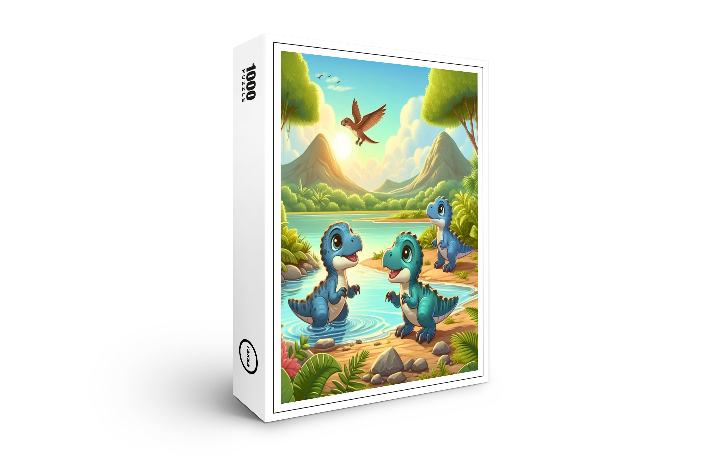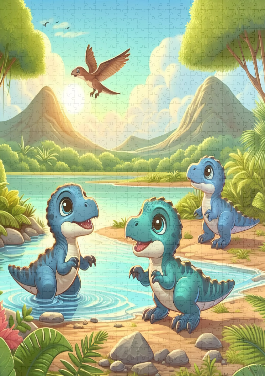 Tre bambini dinosauri giocosi si divertono sulle rive di un fiume scintillante, circondato da una foresta lussureggiante e da montagne maestose. Il sole al tramonto immerge la scena in una calda luce dorata e fa brillare i dinosauri che sguazzano nell'acqua. Il cielo si tinge di tenui colori serali che creano un'atmosfera pacifica e avventurosa.