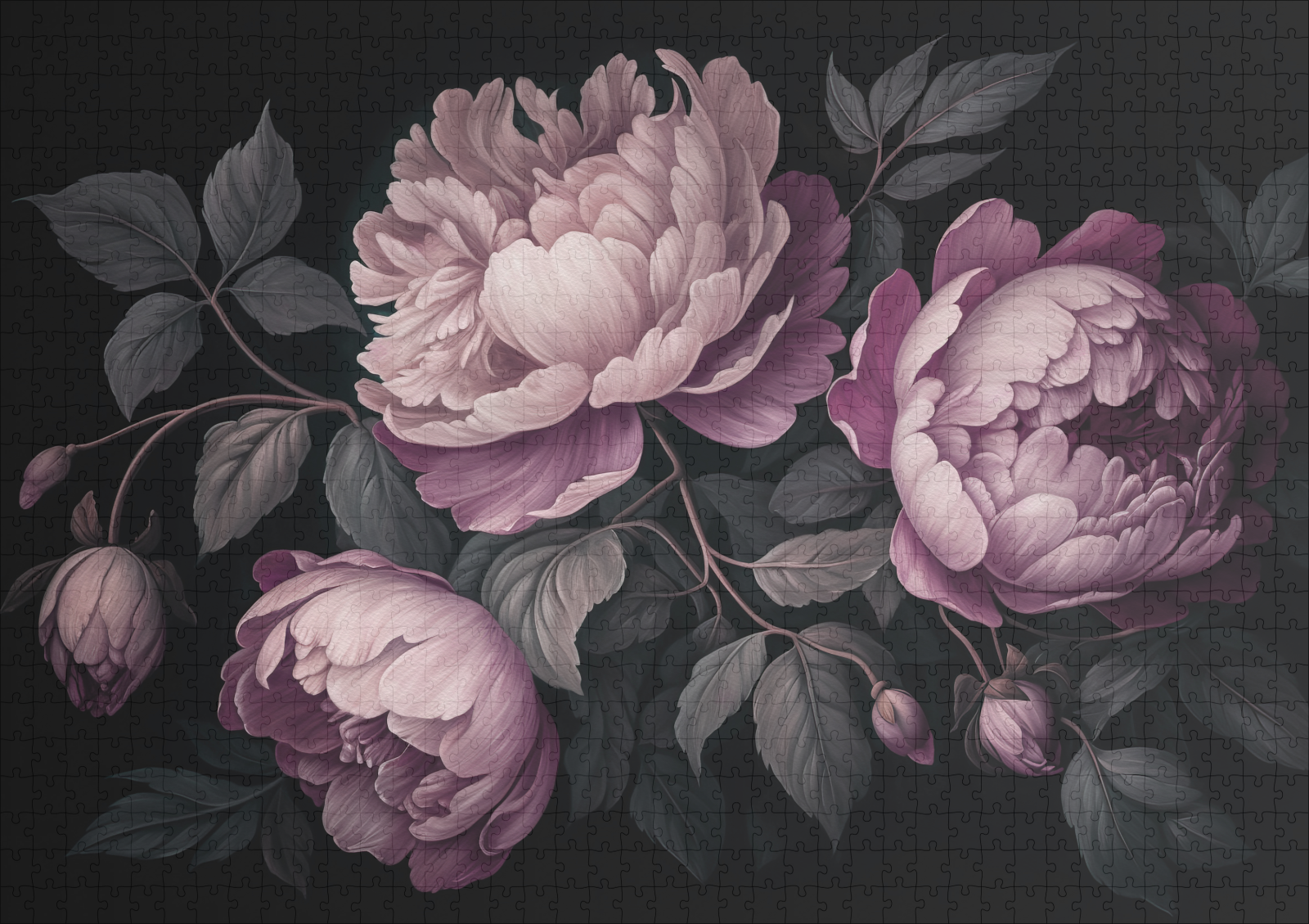 Questo nostalgico disegno floreale gotico presenta un'abbondanza di peonie lussureggianti e rose viola chiaro, sapientemente disposte in una magnifica composizione floreale. Queste opulente fioriture risplendono su uno sfondo misterioso e scuro, creando un affascinante contrasto che ne enfatizza la bellezza. La composizione emana puro lusso e romanticismo vintage e ricorda i tempi passati, quando le composizioni floreali erano simbolo di passione e splendore. Le lussureggianti fioriture di questa composizione incarnano sia la bellezza che le profonde emozioni associate all'estetica gotica e al passato romantico. Questo design crea un'atmosfera elegante e intrigante che riempie la stanza di un fascino nostalgico e sottolinea il romanticismo oscuro dei fiori.