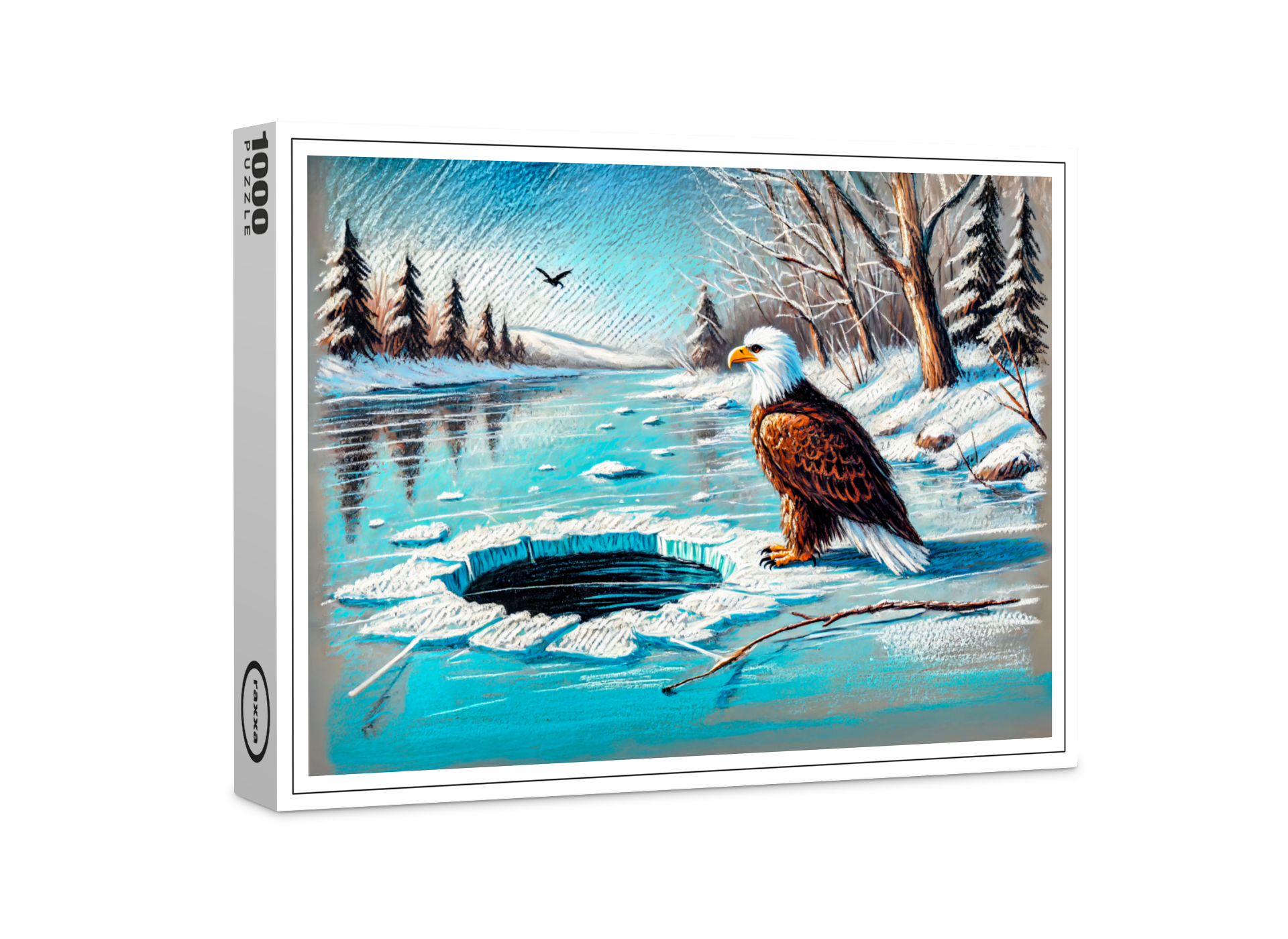 eagle sits on a frozen river by an ice hole, patiently waiting for prey. This artwork captures the serene beauty of winter and wildlife in a stunning pastel chalk drawing