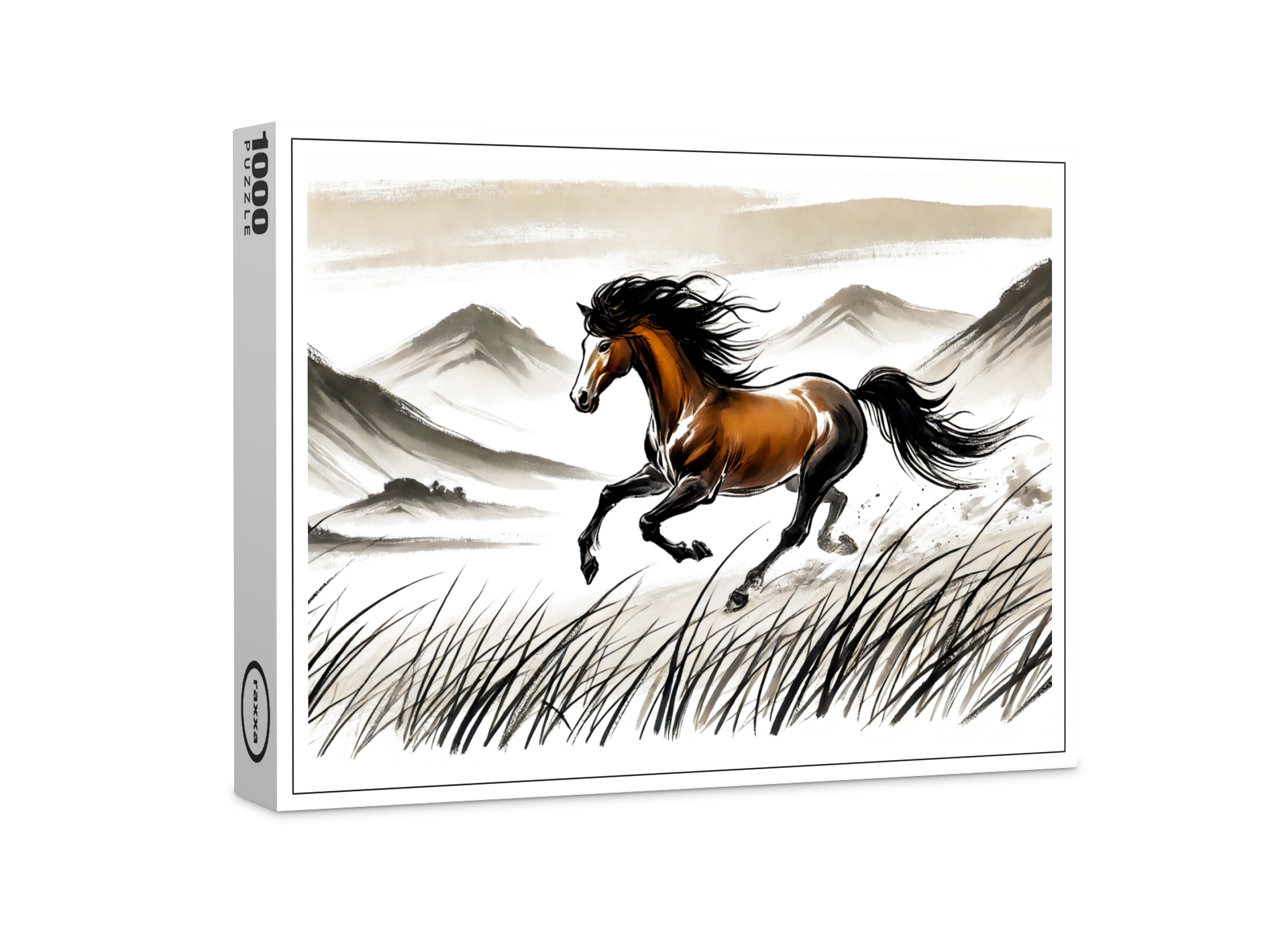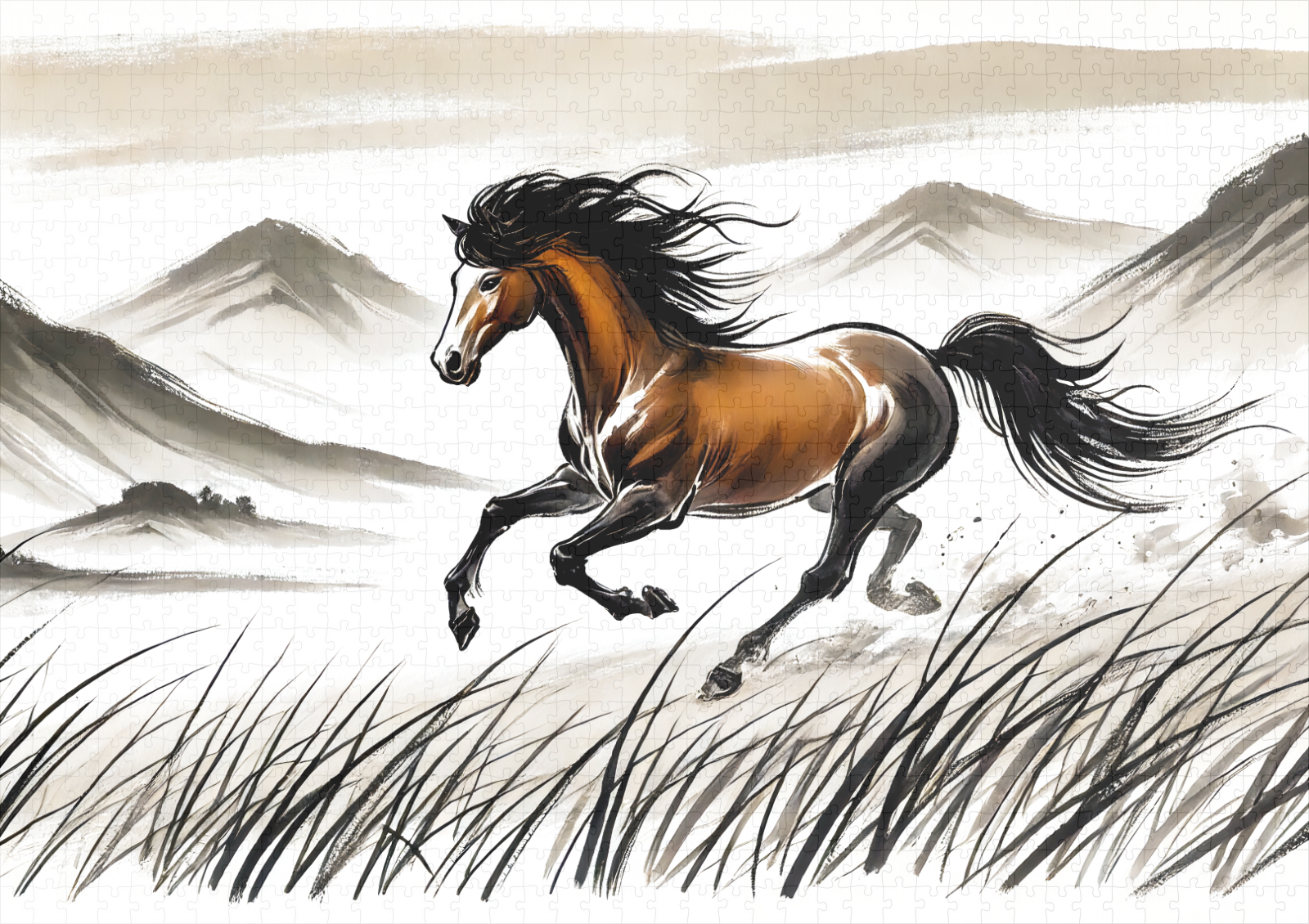 spirited horse runs freely across a vast pasture in this lively ink drawing.