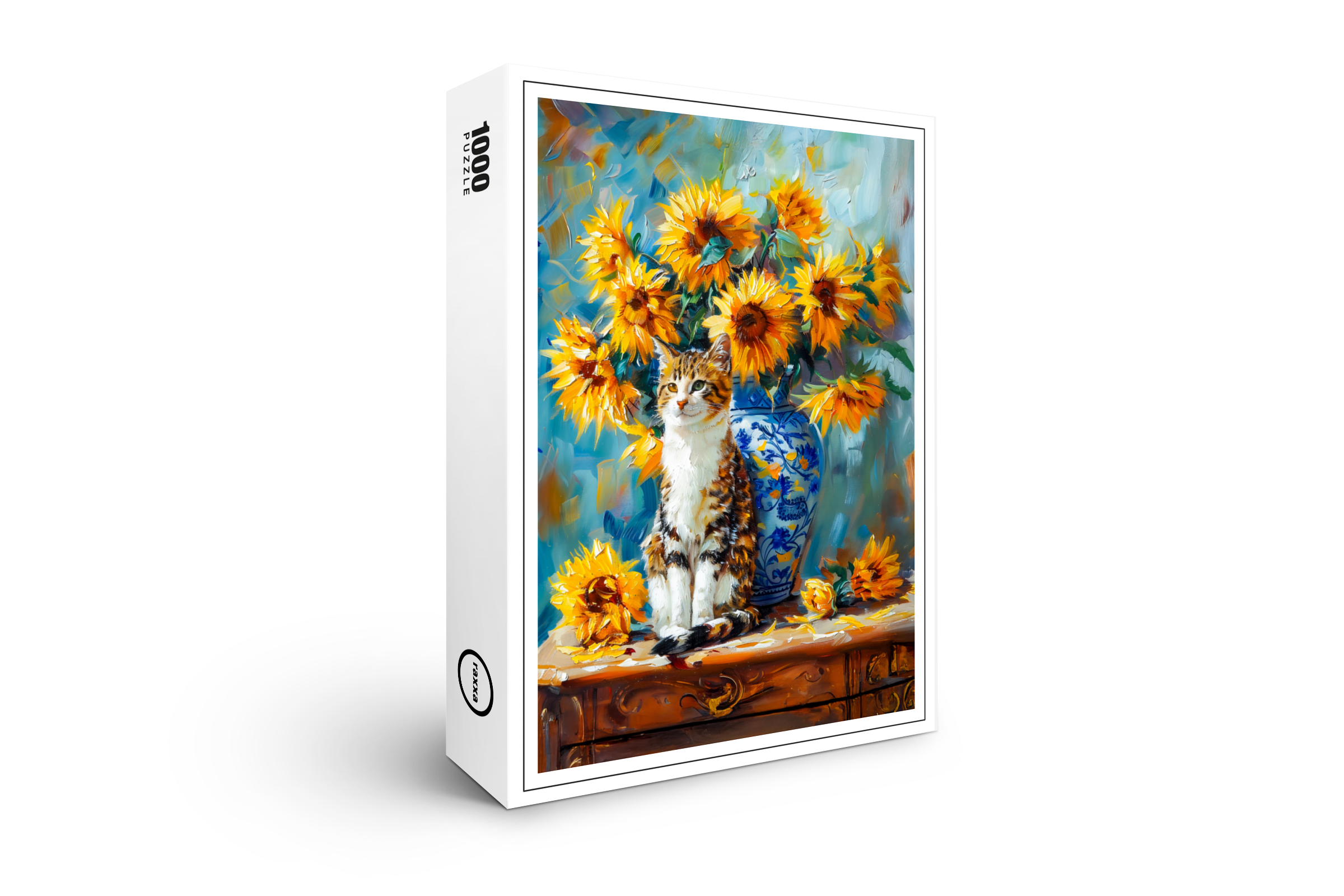 An impressionistic oil painting of a cat sitting on a table in front of a large sunflower bouquet. A vibrant and serene scene blending feline charm and floral beauty.