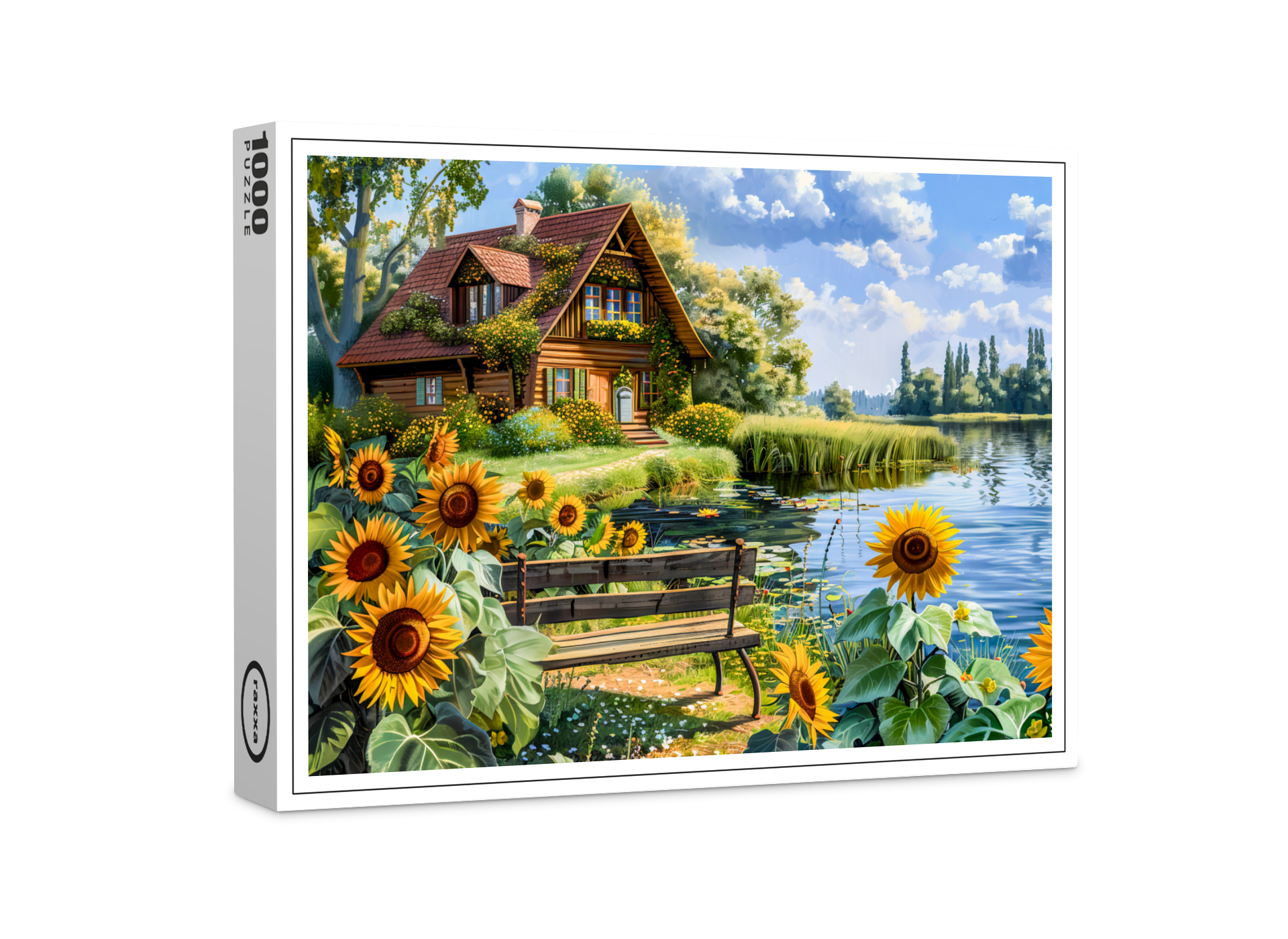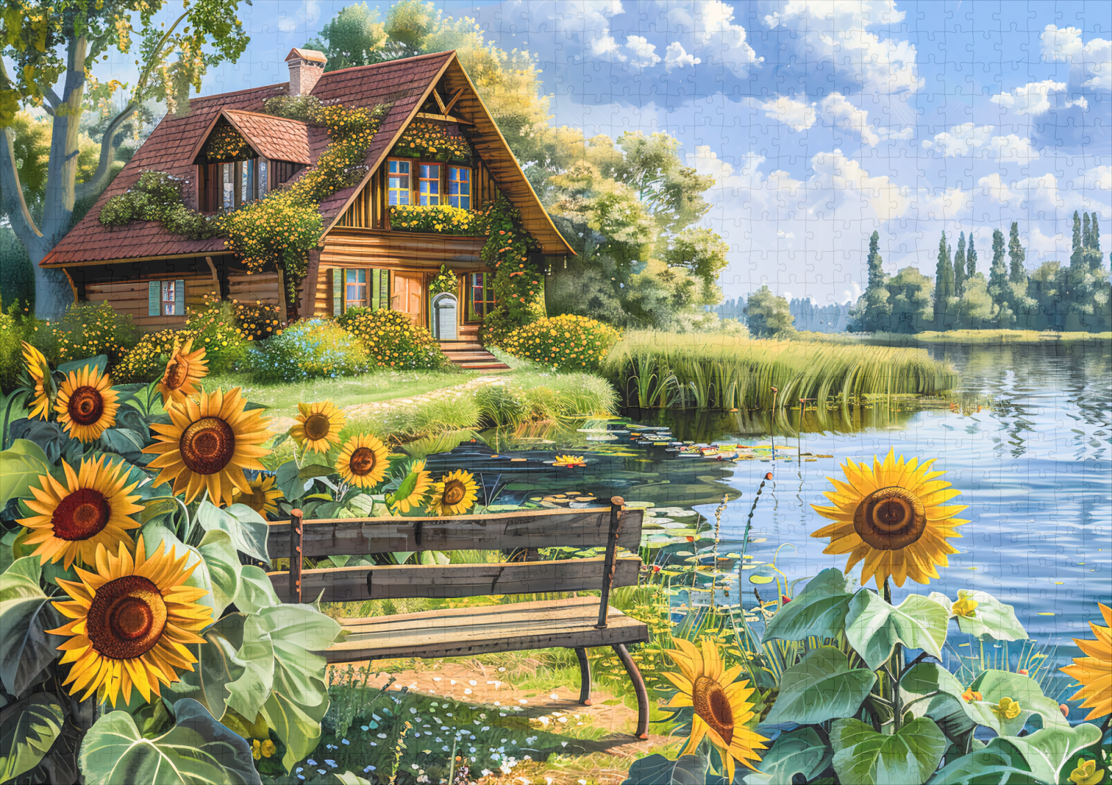 „Lakeside Cottage with Sunflower Field“ by Anja Frost