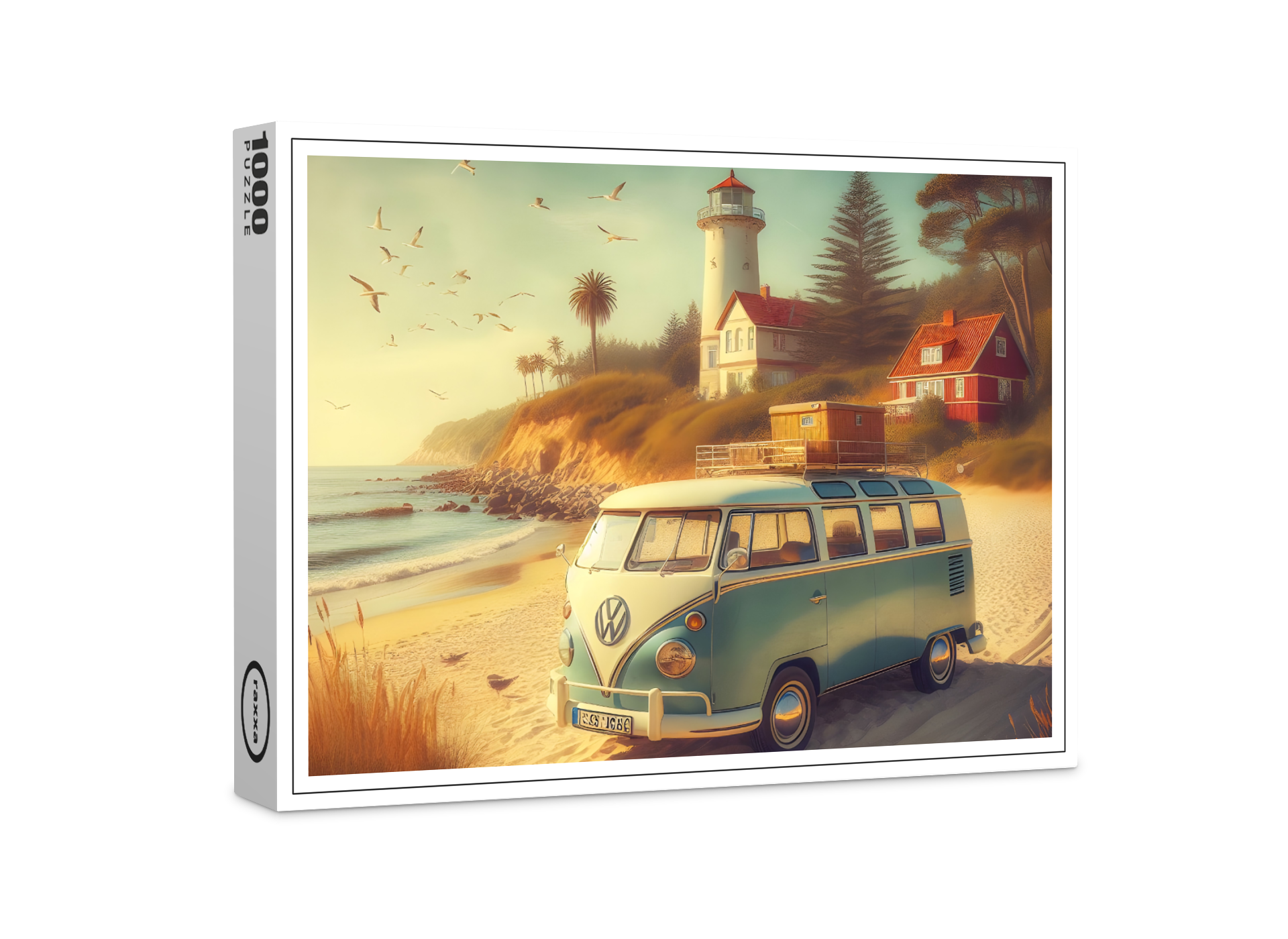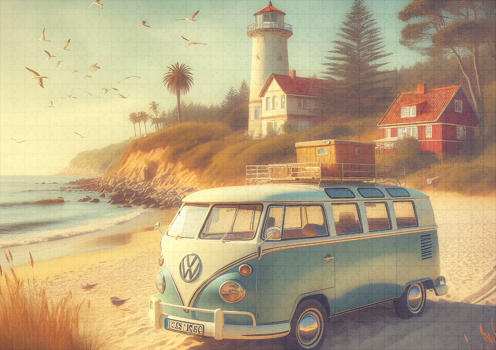 Un classico autobus VW è parcheggiato sulla spiaggia, con un vecchio faro che si erge maestoso sullo sfondo, illuminato dal sole al tramonto.