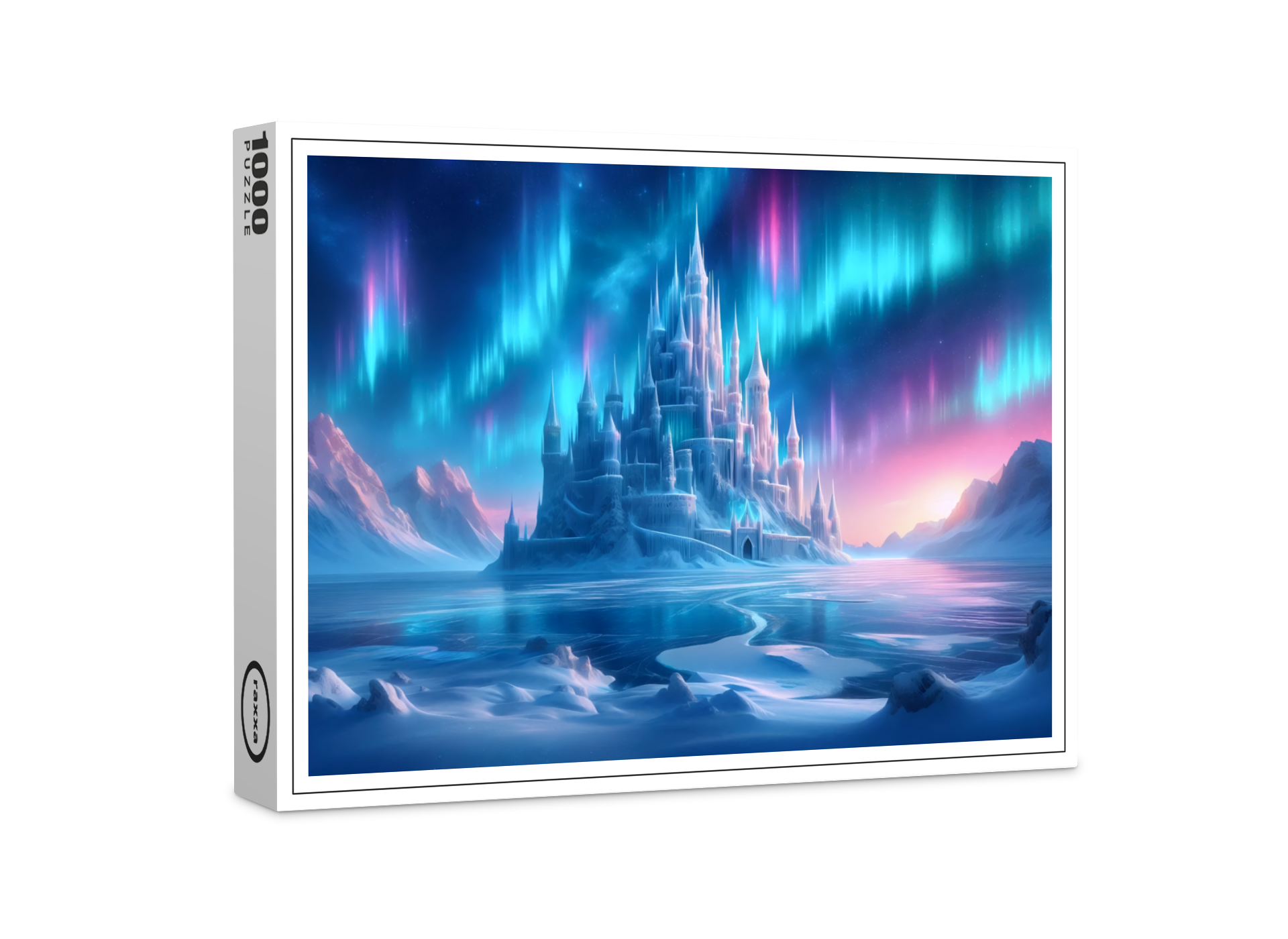 Das Bild zeigt ein beeindruckendes, strahlendes Eisschloss, umgeben von schneebedeckten Bergen und einem wunderschönen Himmel mit Nordlichtern in verschiedenen Farben.