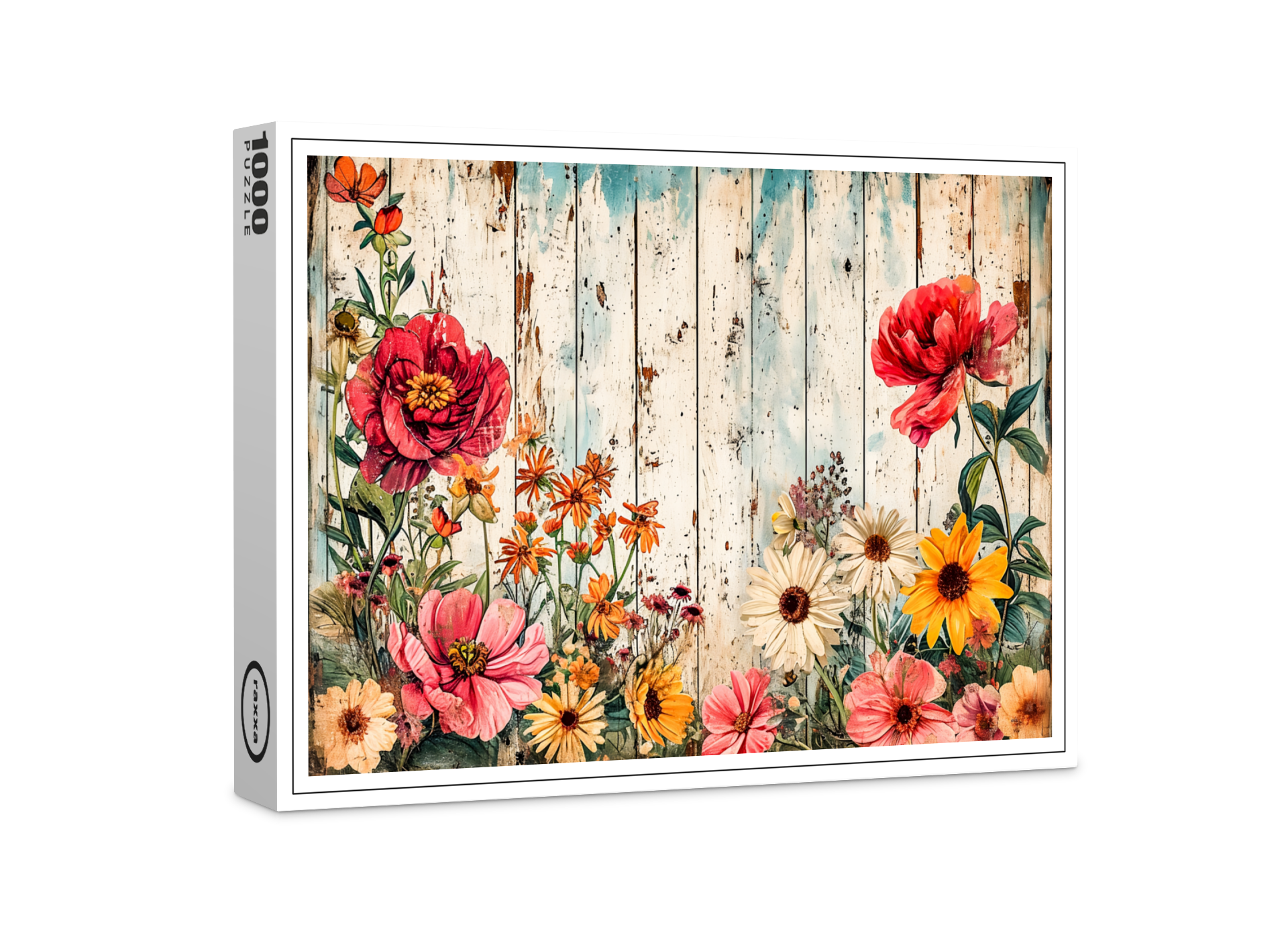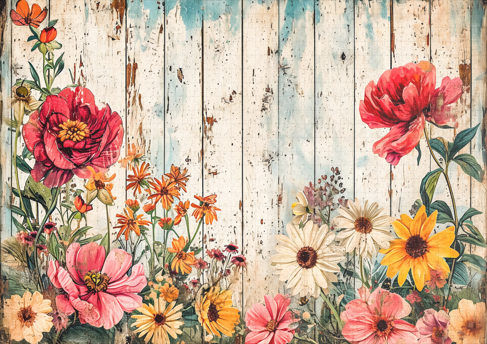 A charming floral scene with pink poppies, white daisies, and scattered wildflowers arranged against weathered turquoise wood. A soft and romantic shabby chic composition with countryside flair.
