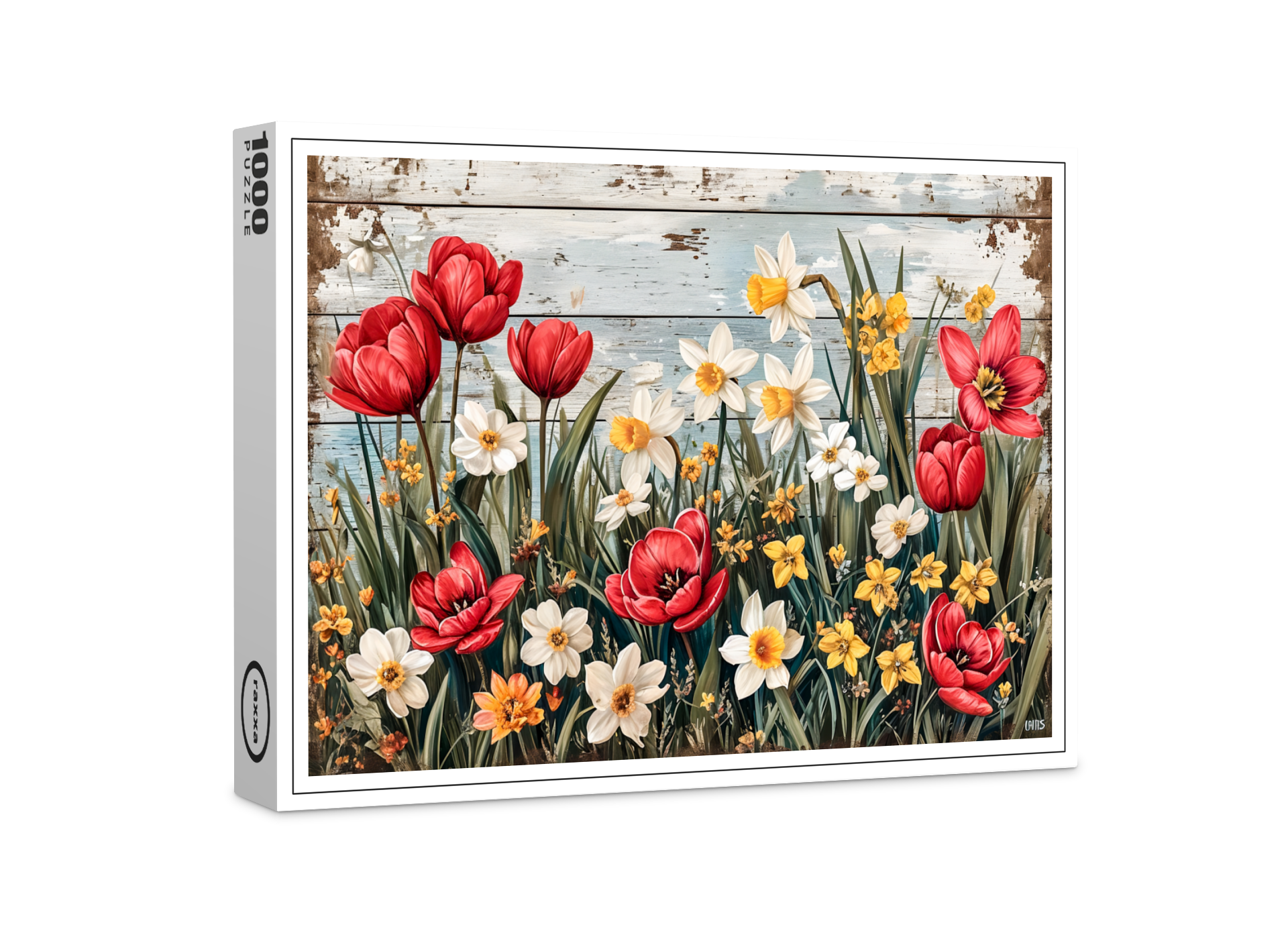 radiant mix of red tulips, white daisies, and yellow wildflowers blooms over faded white wooden boards. A fresh floral still life full of rustic charm and vintage inspiration.
