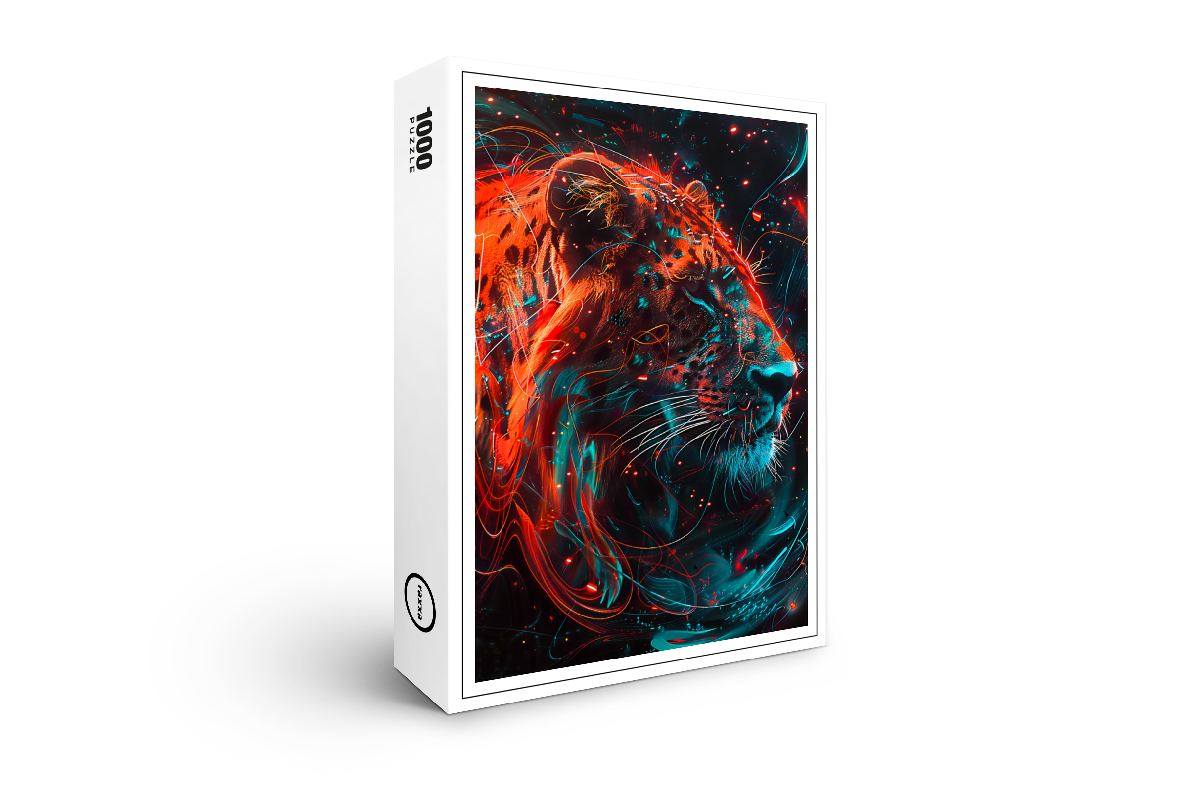 lion highlighted by reddish turquoise neon light trails, creating a cosmic and captivating scene.