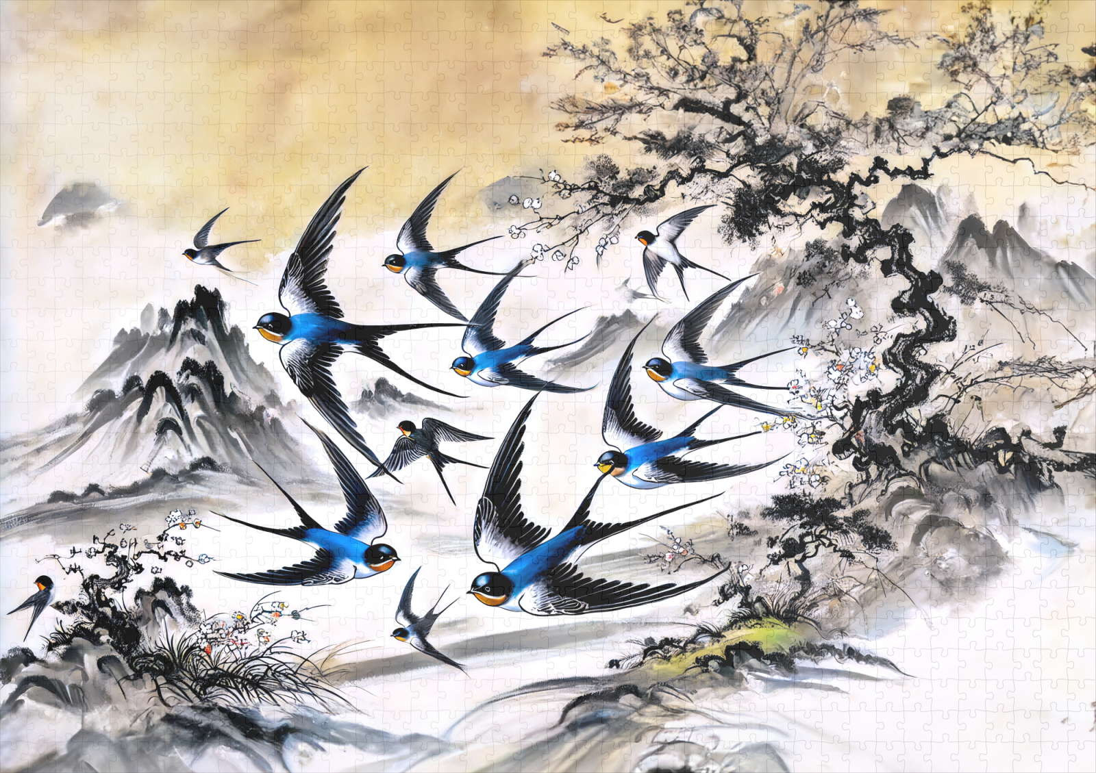 „Swallows Soaring Through the Sky in Chinese Ink Painting“ by Anja Frost