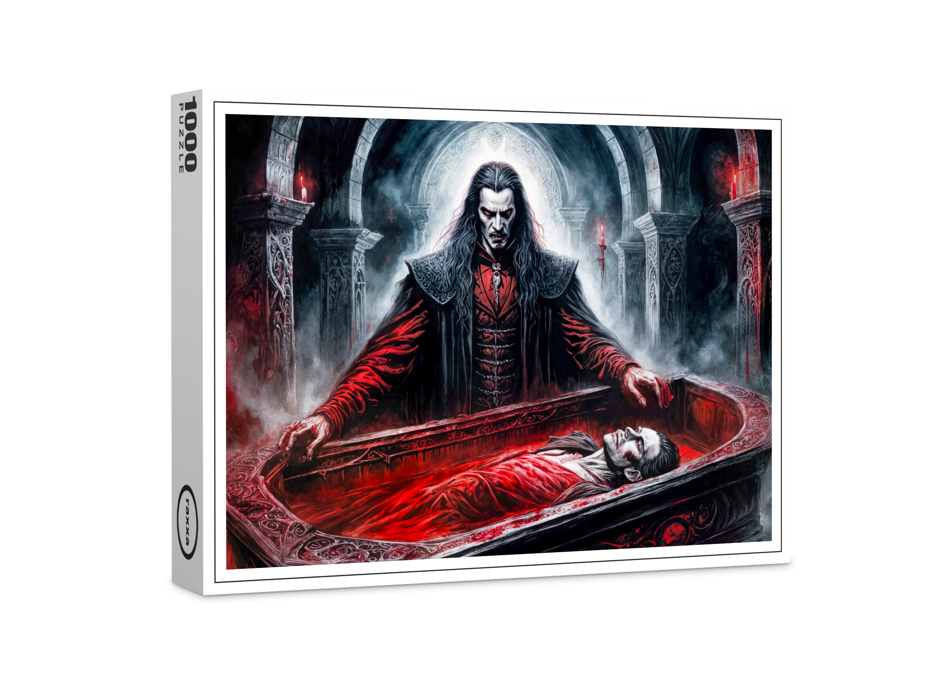menacing vampire emerges from a blood-red coffin in a dimly lit, gothic chamber. The scene is filled with eerie mist and dramatic lighting, highlighting the vampires ominous presence and the ornate surroundings.