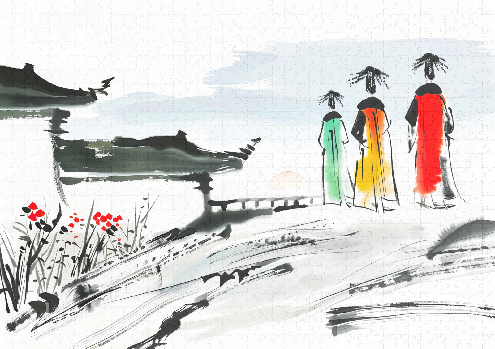 detailed ink painting of visitors walking through the courtyard of a traditional Chinese temple, capturing the harmony between people and sacred space.