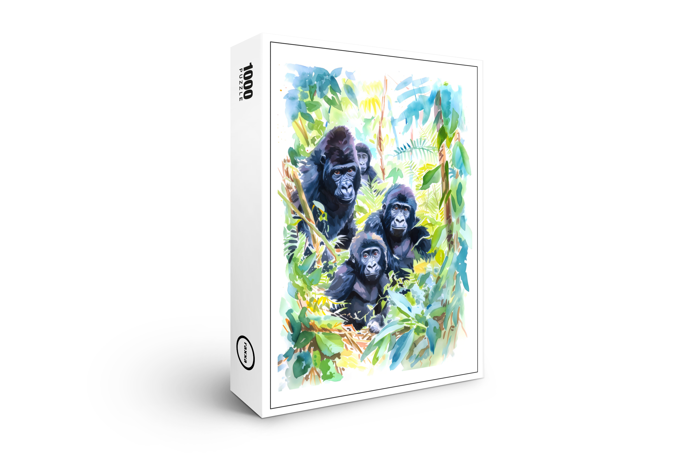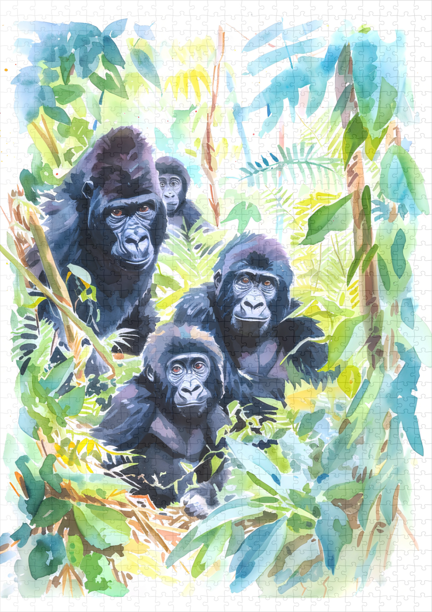 Watercolor painting of a gorilla group nestled among lush jungle leaves, full of expression and emotion.