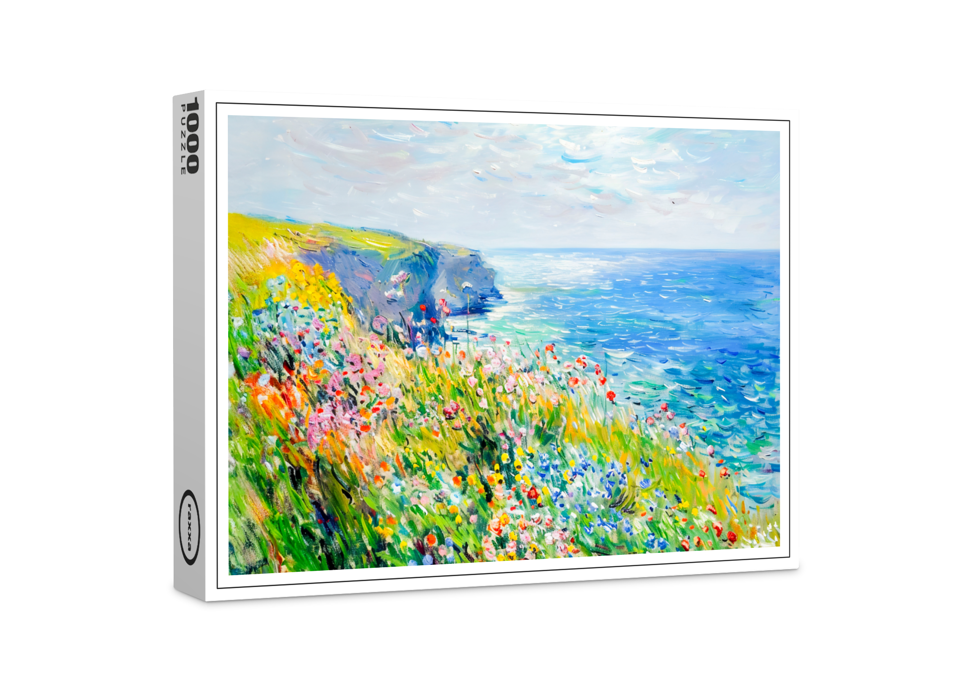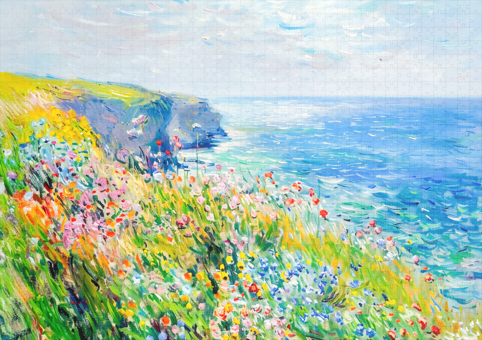 impressionist landscape of a coastal cliff covered in vibrant wildflowers. The soft, expressive brushstrokes capture the beauty of nature by the sea in full bloom.