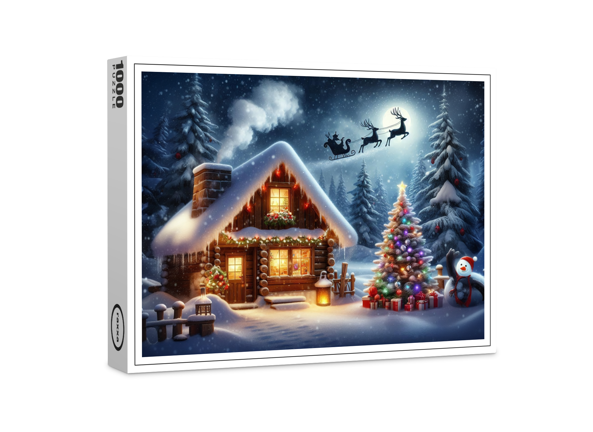 In una tranquilla notte d'inverno, un'accogliente casetta di legno si trova nel mezzo di una foresta innevata. Il fumo sale dal camino verso il cielo limpido della notte. Un albero di Natale luminoso illumina la scena, mentre la neve scintilla al chiaro di luna e una magica atmosfera invernale riempie l'aria.