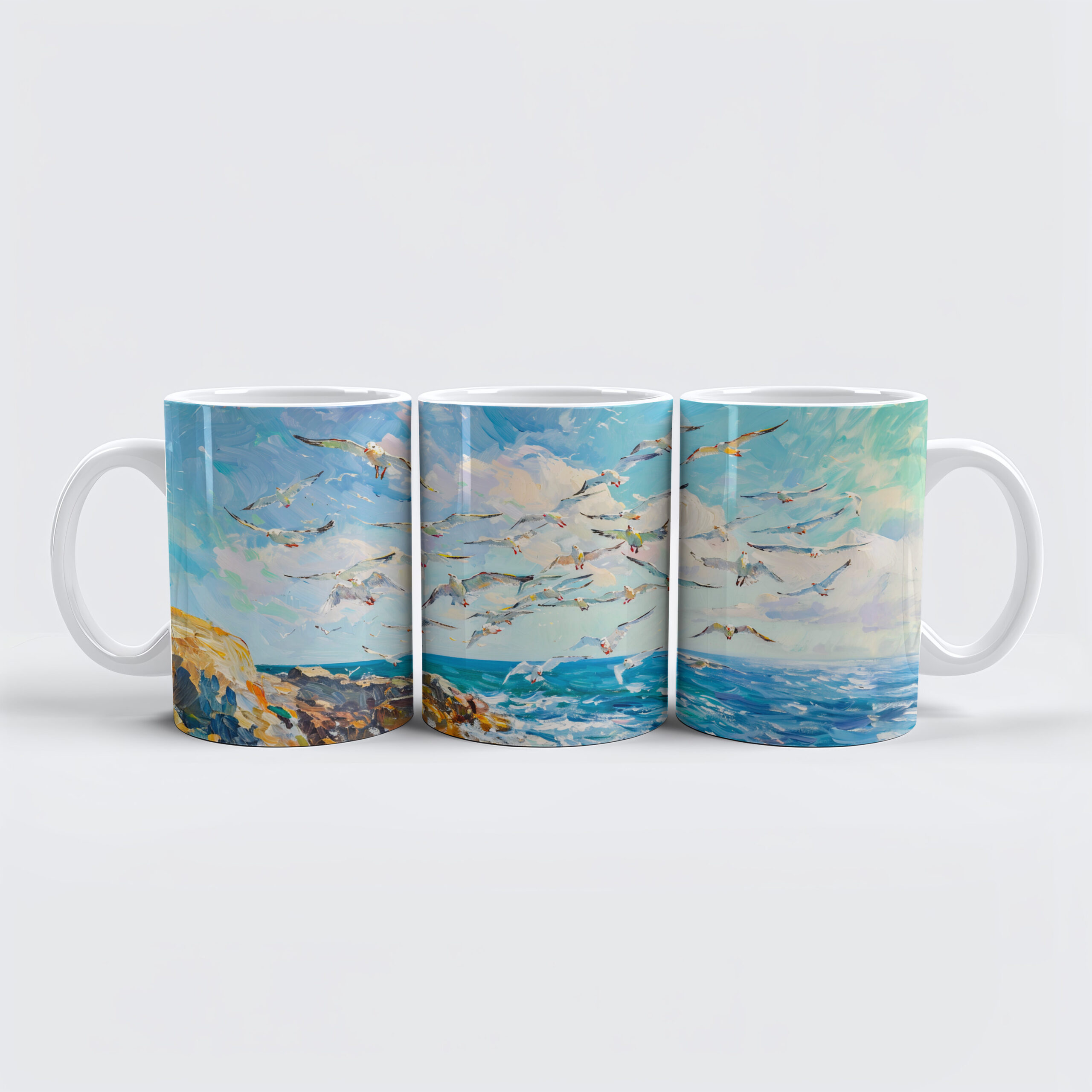 lively impressionist painting of seagulls soaring above the waves. The dynamic brushstrokes capture the energy of the sea, wind, and sky in a vibrant coastal composition.