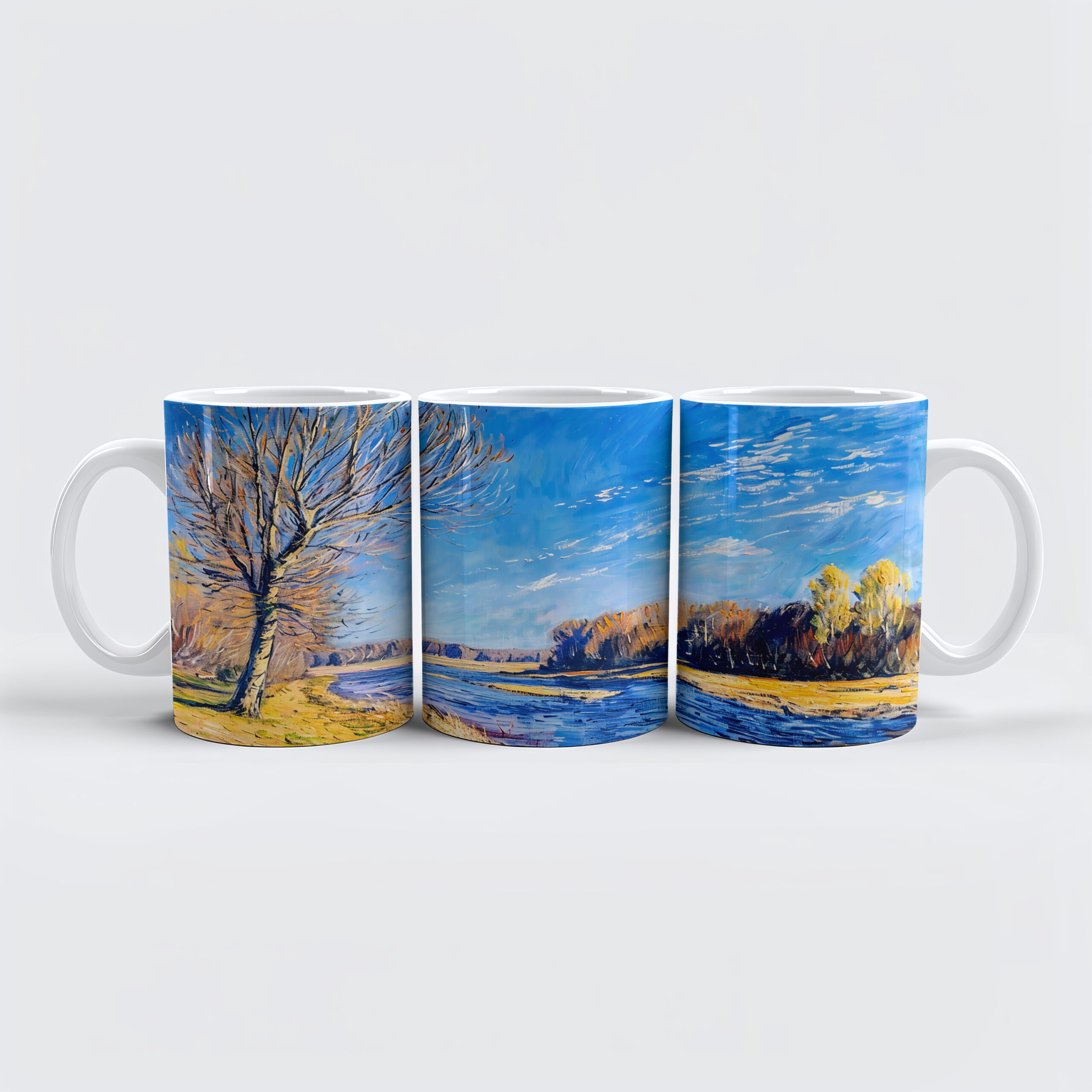 Solitary tree at the bank of a calm river in early spring. Gentle reflections shimmer on the water, surrounded by tender greens and soft sunlight in an impressionistic landscape.