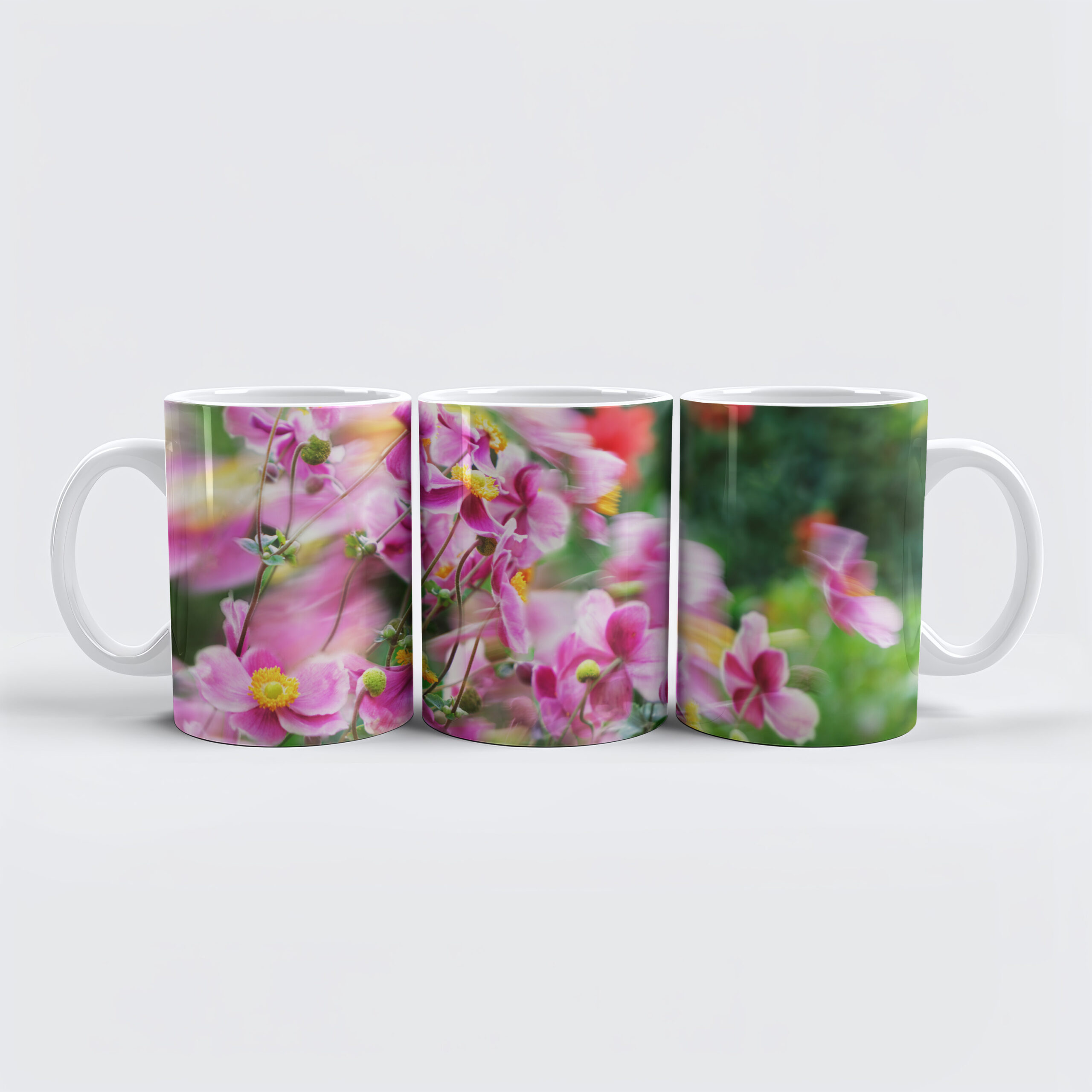 Composizione di fiori mossi e fermi dal vento nei toni del rosa, del viola e del giallo