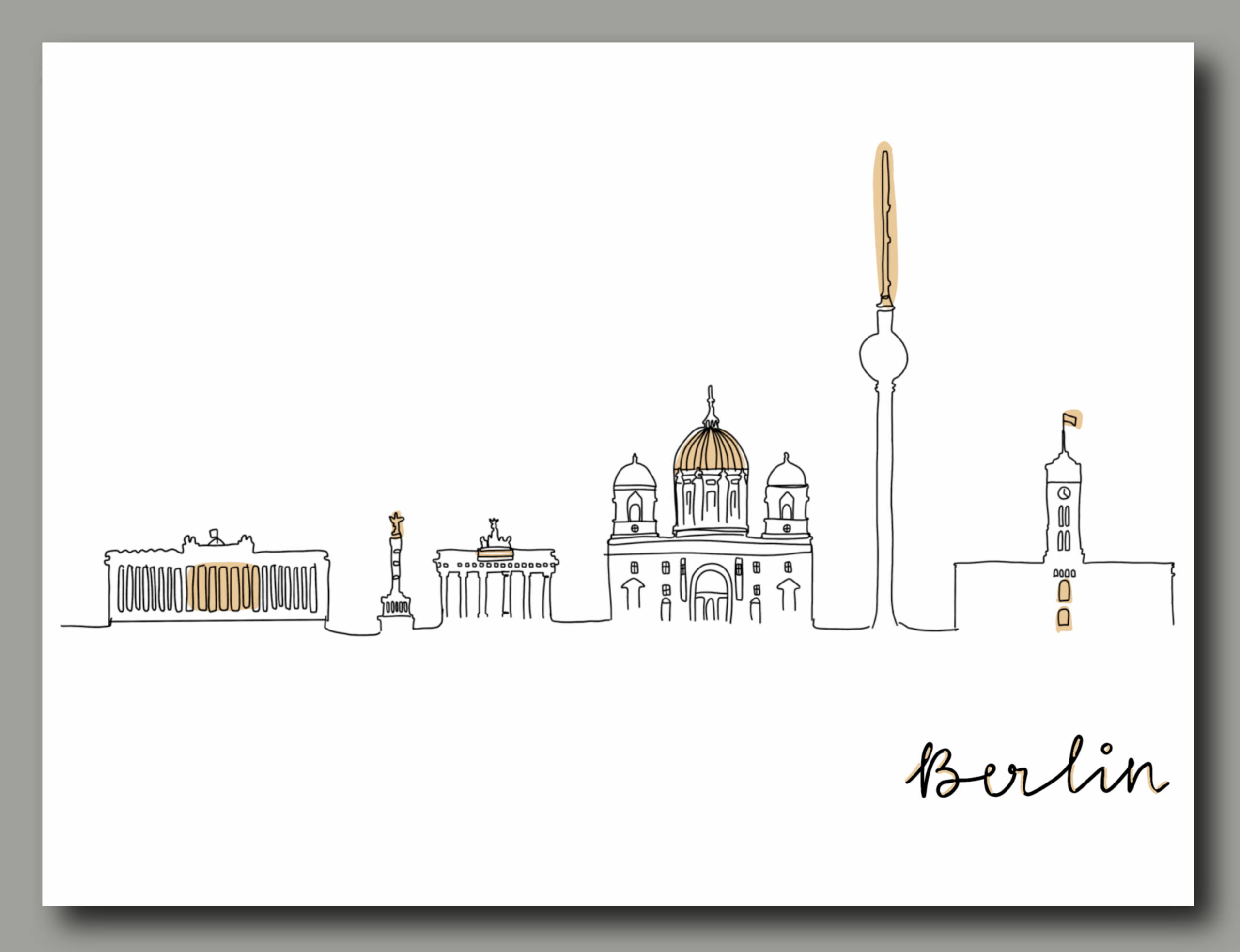 Lo skyline di Berlino è un insieme impressionante di grattacieli moderni, edifici storici e punti di riferimento iconici. Nello stile della line art, diventa la pura essenza di linee e forme. I contorni netti della cima della torre della televisione, la silhouette della Porta di Brandeburgo e le linee curve del fiume Sprea si fondono in un'opera d'arte minimalista.