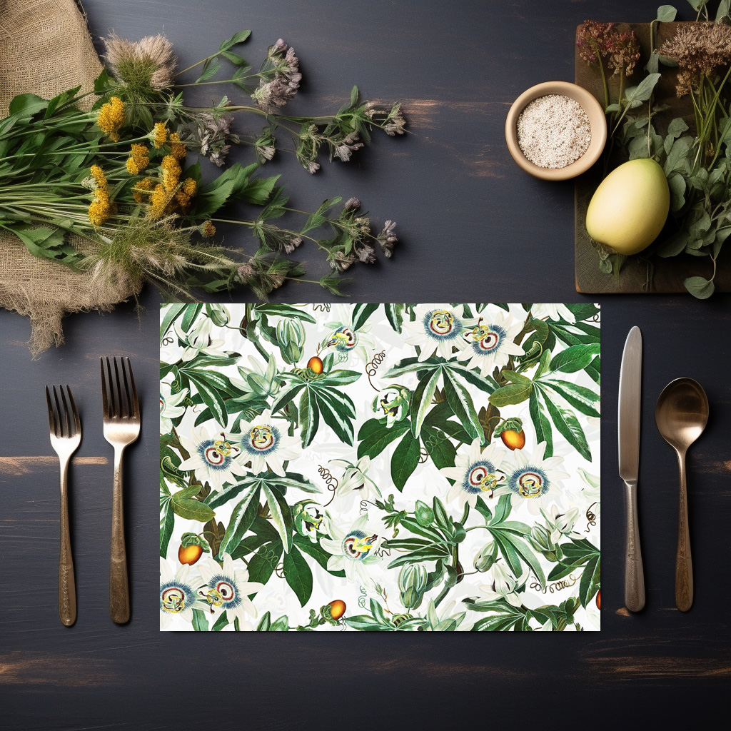 Un esotico motivo vintage di ispirazione tropicale presenta l'ammaliante bellezza dei fiori della passione su uno sfondo bianco puro. I fiori esotici e vibranti, con i loro colori affascinanti e le loro forme complesse, creano un'aura di eleganza e grazia. Il design lussuoso è intervallato da dettagli ornamentali che aggiungono un tocco opulento al disegno. Questa composizione combina la sublime bellezza naturale dei fiori della passione con un tocco di splendore esotico e irradia un'atmosfera lussuosa e senza tempo che seduce i sensi e trasporta nel mondo dei tropici.
