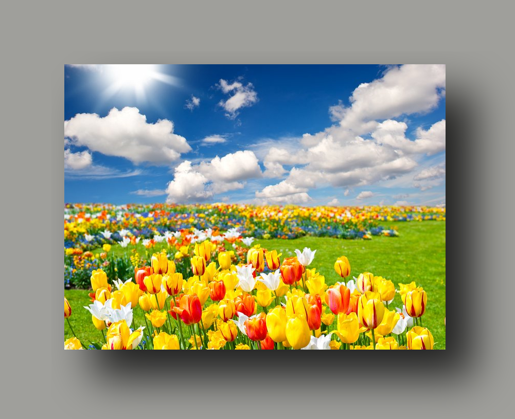 Campo di tulipani in fiore sotto un cielo blu brillante