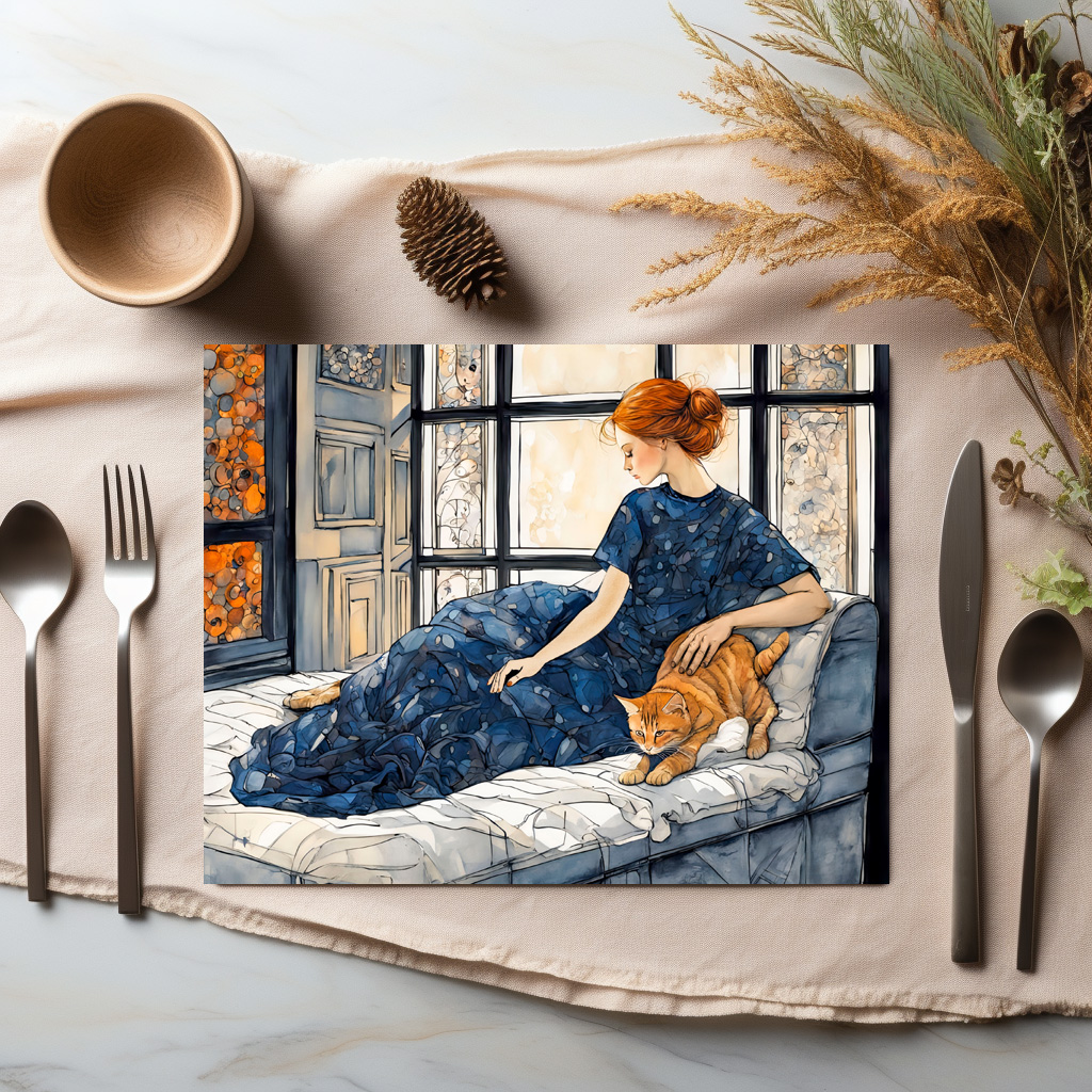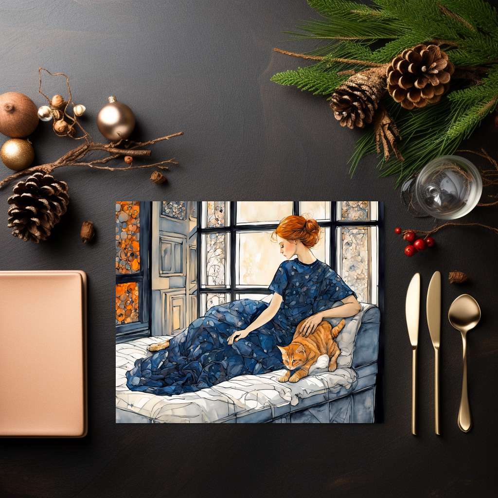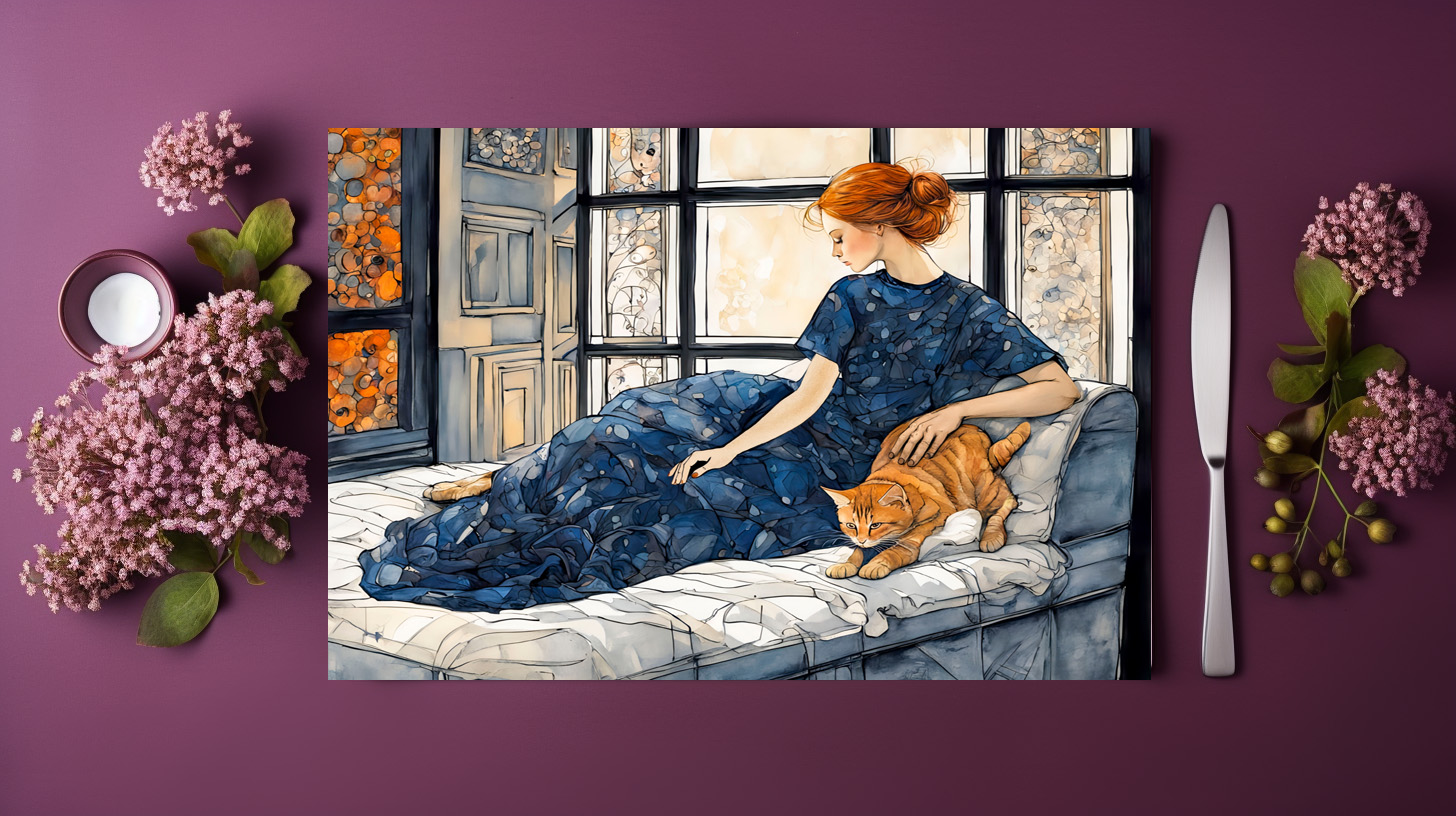 cozy watercolor painting of a woman in a dark dress sitting by a window with her orange cat. Warm light and soft textures create a peaceful atmosphere.