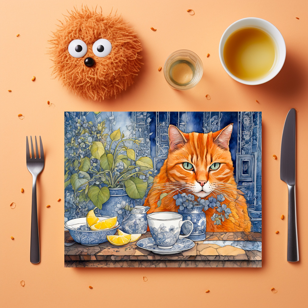 beautiful watercolor artwork featuring an orange tabby cat sitting near a lemon tea set on a rustic blue table. A charming and vibrant scene.